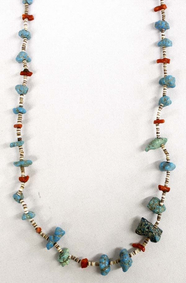 Vintage Native American Turquoise Nugget Necklace, shell heishi and coral, measures 30''L end to end, largest nugget measures .75''L