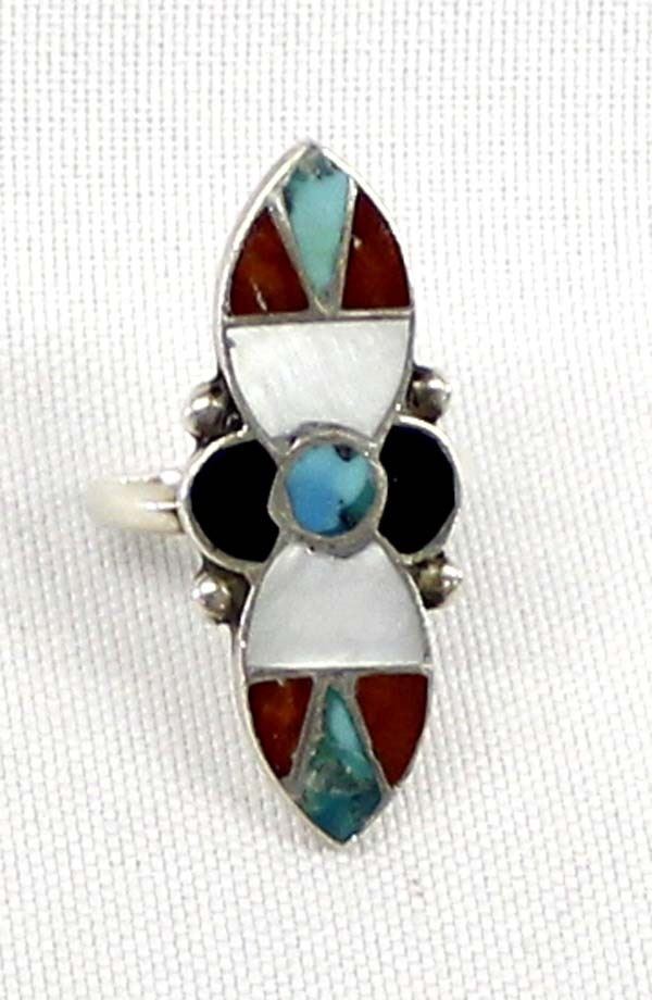 Vintage Native American Zuni Inlay Ring, Size 6.75, inlay of mother of pearl, turquoise, jet, and turquoise, measures 1 3/8''L x 5/8''L