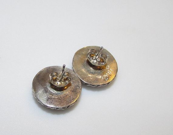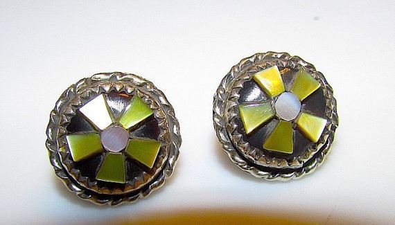 For your consideration are these gorgeous vintage Native American Zuni sterling silver, yellow and white mother of pearl and jet mosaic inlay floral pierced earrings in wonderful vintage condition. This fabulous pair of earrings features an intricate, floral design in sterling silver accented with lustrous yellow and white mother of pearl and black jet inlay. . The earrings are unmarked as most vintage Native American jewelry and have been tested for silver content. Measure about 1/2" in diameter. Stunning example of vintage Native American art to add to any collection!