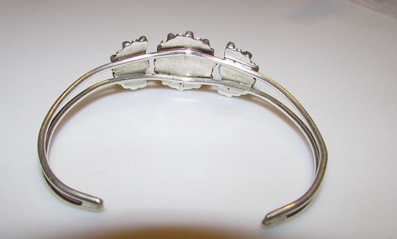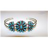 For your consideration is this wonderful smaller vintage Native American Zuni sterling silver Sleeping Beauty turquoise cluster rosette cuff bracelet in wonderful vintage condition by the highly collectible Zuni artist Judy Wallace. This fabulous piece features a traditional Zuni cluster rosette design in sterling silver accented with genuine sky blue turquoise cluster design. The cuff is marked 'Sterling" is signed by the artist, and marked "ZUNI". Measures about 3/4" wide and the inside circumference is about 6" including gap. The gap is about 1 1/2" wide. The cuff can be carefully adjusted. All stones are original and intact. Stunning example of vintage Native American art to add to any collection!