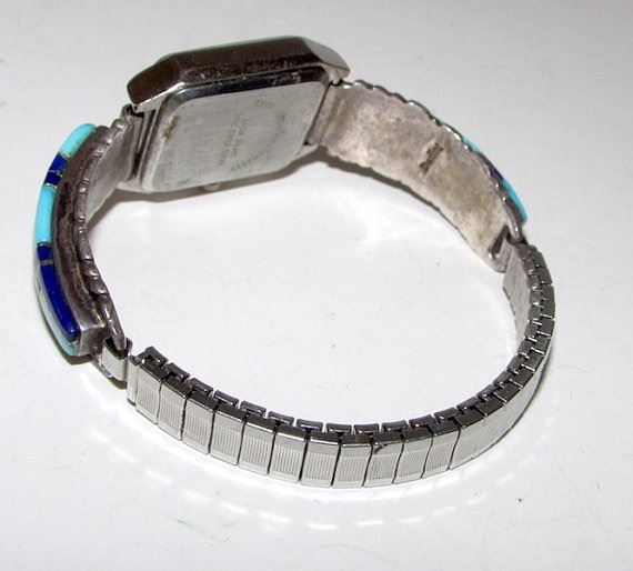 For your consideration is this exquisite vintage Zuni sterling silver, turquoise and lapis mosaic inlay design watch band with watch. The watch remains in wonderful condition. This exceptional piece features an intricately hand crated turquoise and lapis mosaic inlay design in sterling silver setting. Exceptional attention to detail in this fantastic piece, rare opportunity to acquire this beauty. The watch band comes with the watch. The watch is in nice vintage condition, the battery will need to be replaced. The watch tips are marked "sterling" on the inside. No visible hallmark. The watch is adjustable and is about 1" wide at the widest point. Superb addition to any jewelry collection!