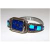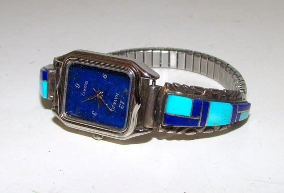For your consideration is this exquisite vintage Zuni sterling silver, turquoise and lapis mosaic inlay design watch band with watch. The watch remains in wonderful condition. This exceptional piece features an intricately hand crated turquoise and lapis mosaic inlay design in sterling silver setting. Exceptional attention to detail in this fantastic piece, rare opportunity to acquire this beauty. The watch band comes with the watch. The watch is in nice vintage condition, the battery will need to be replaced. The watch tips are marked "sterling" on the inside. No visible hallmark. The watch is adjustable and is about 1" wide at the widest point. Superb addition to any jewelry collection!