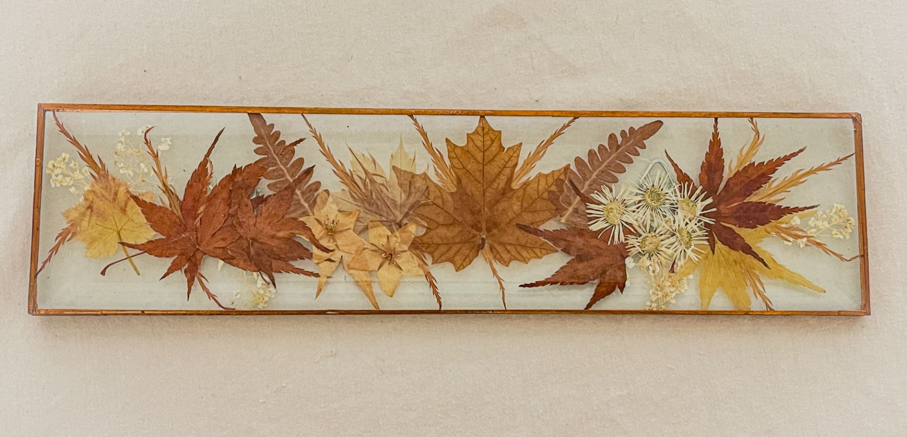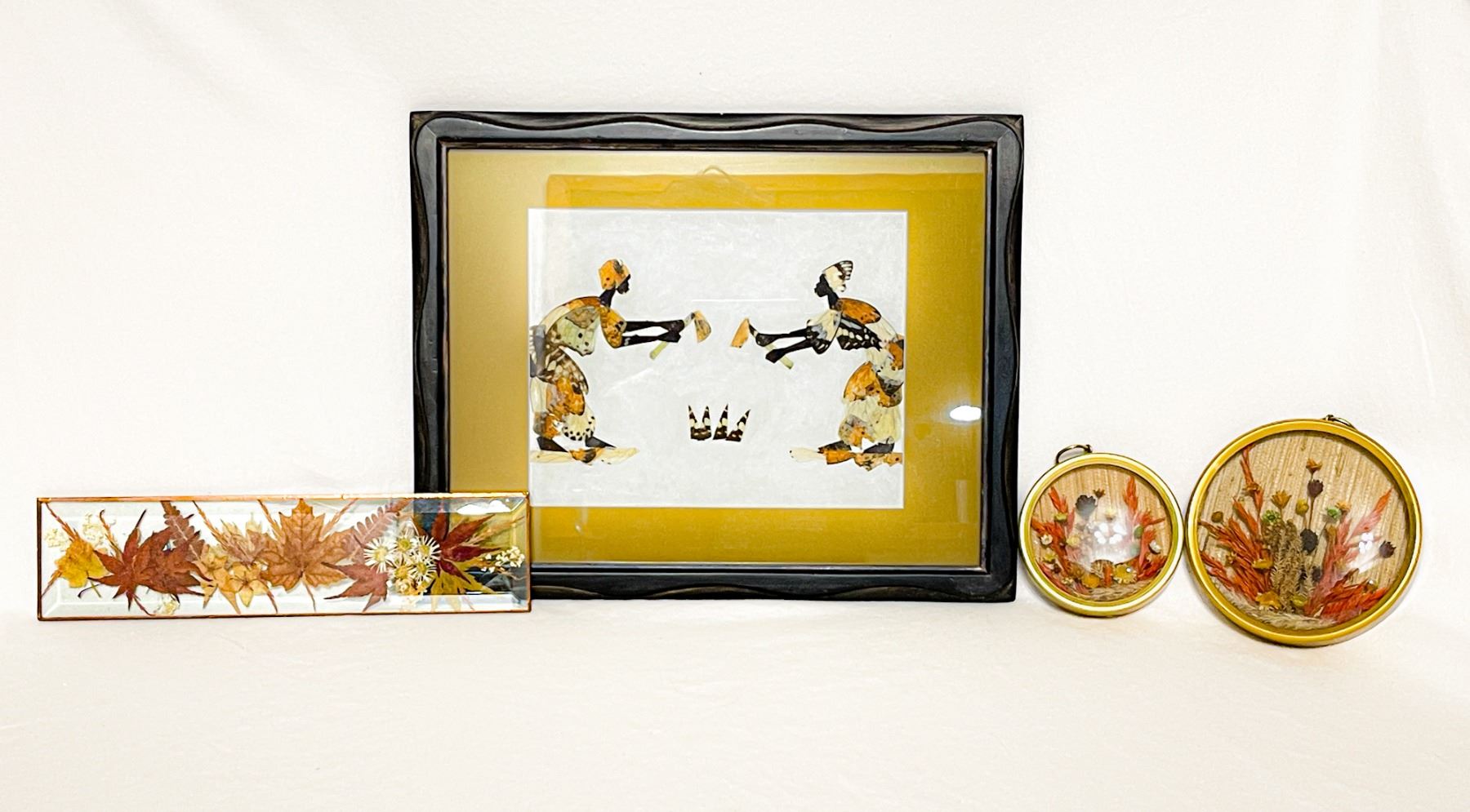 Mixed set includes: Pressed flower stained glass panel, Two round domed dried flower frames, Tribal/ethnic butterfly wing collage