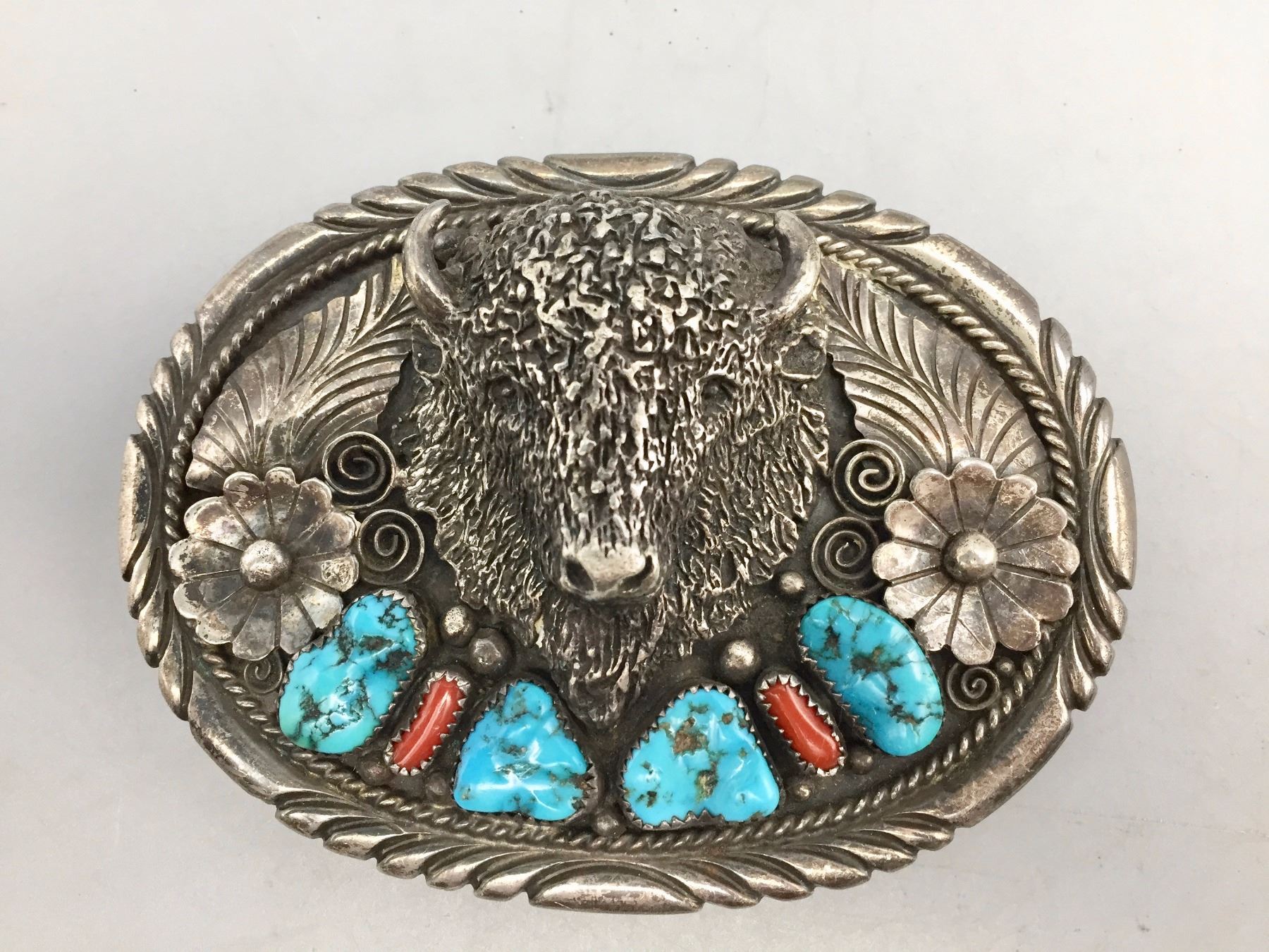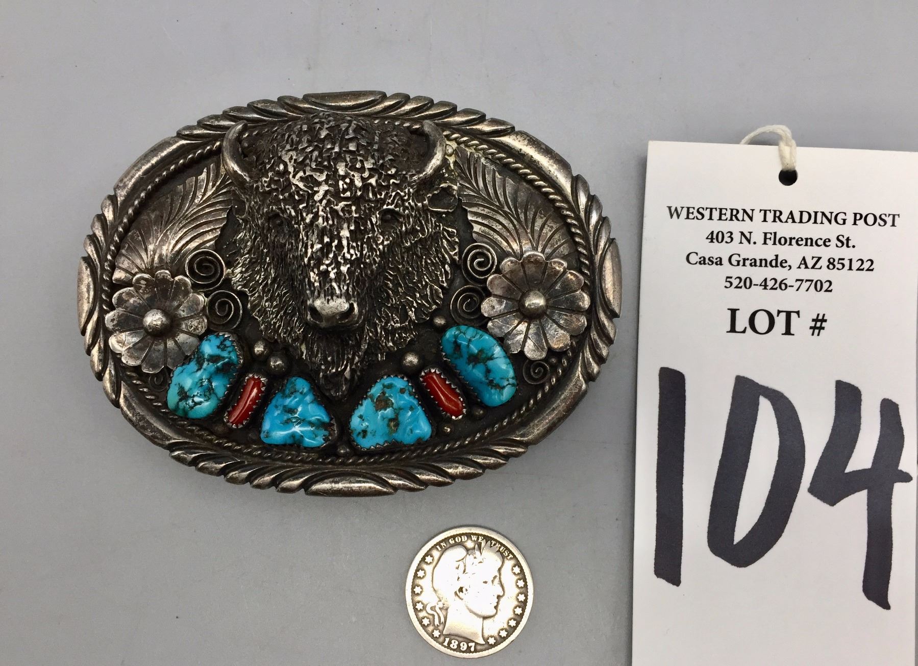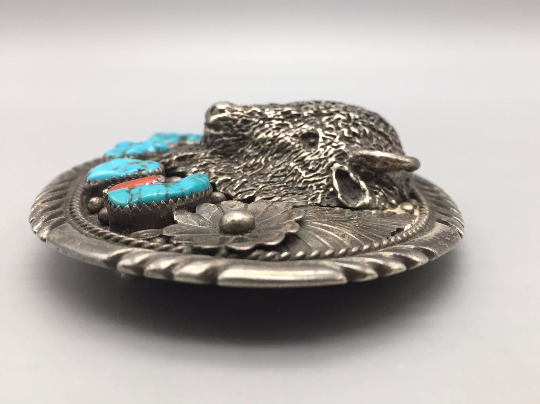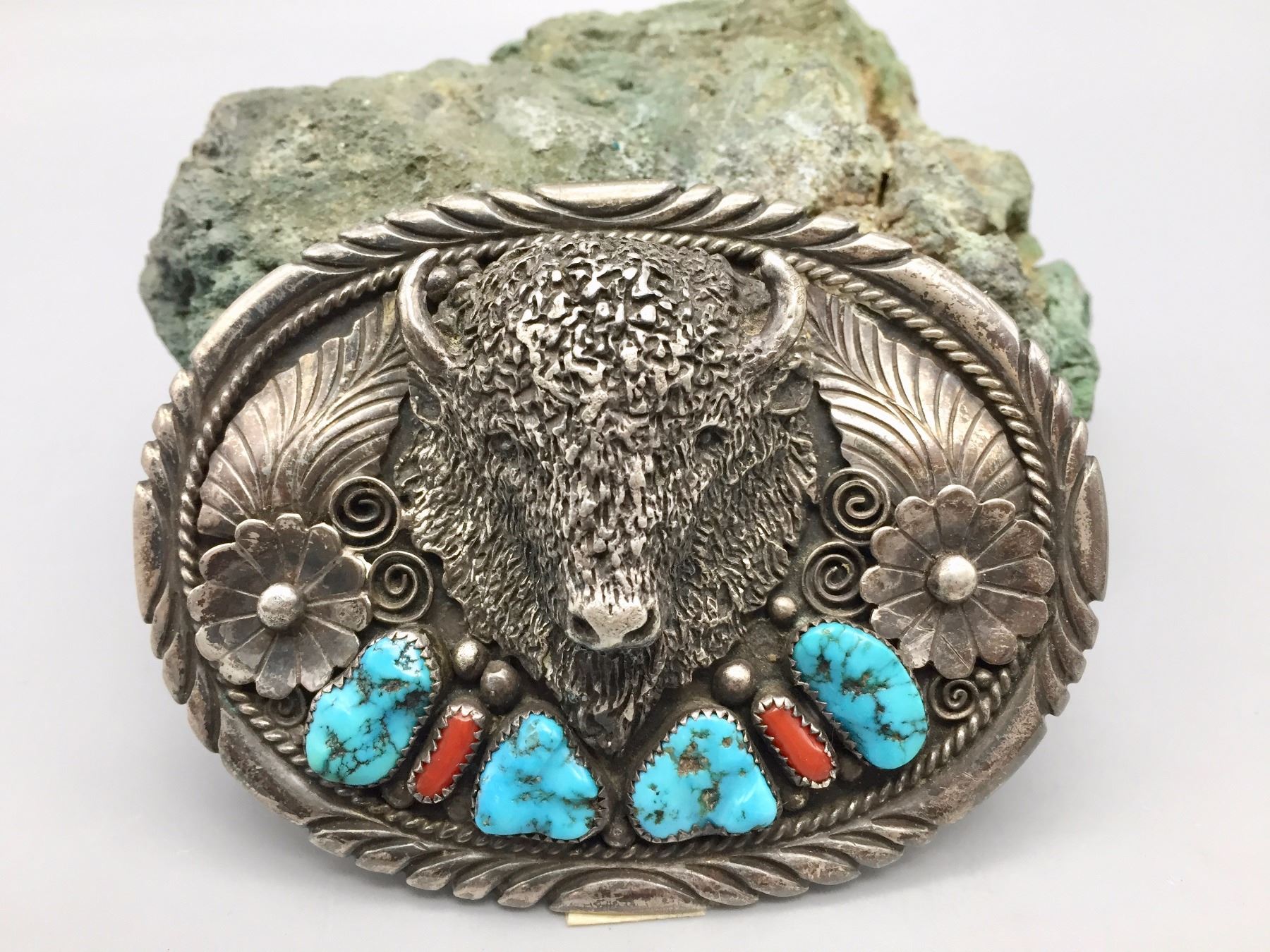 Description: Sterling silver belt buckle with coral and turquoise cabochons and a sterling buffalo head. Maker: Hallmarked, Lester Yazzie. Approx. Age: Vintage. Size: Buckle measures 4” l x 3” w. Weighs 120.3 g. Condition: Good for its age, normal wear expected. Please look closely at the pictures - they are an important part of our description. Shipping: There will be a $5 handling / packaging fee for shipping this lot. The actual cost of postage will be added on top of that.