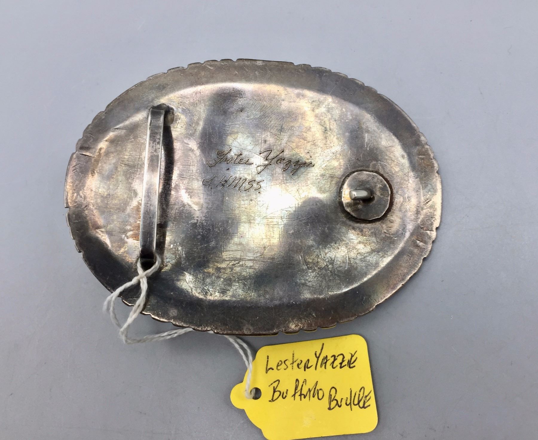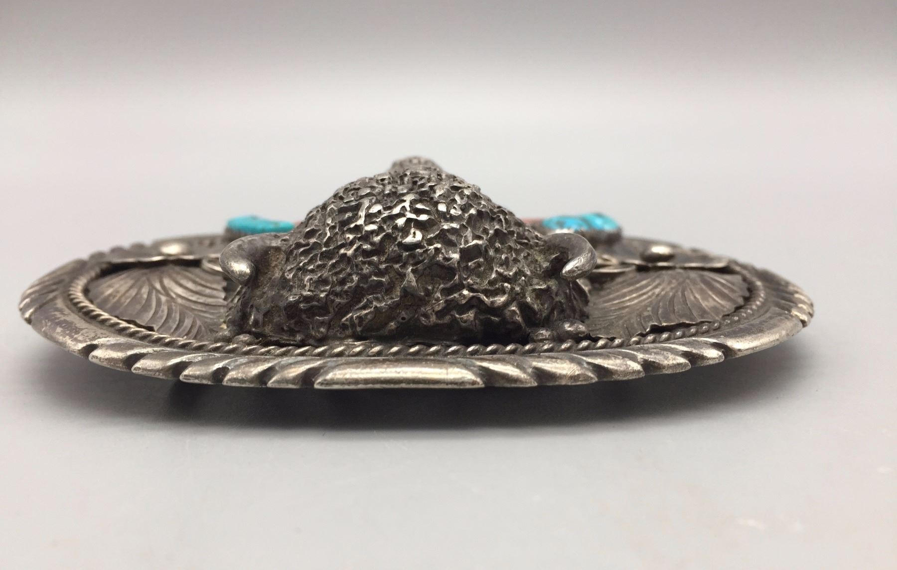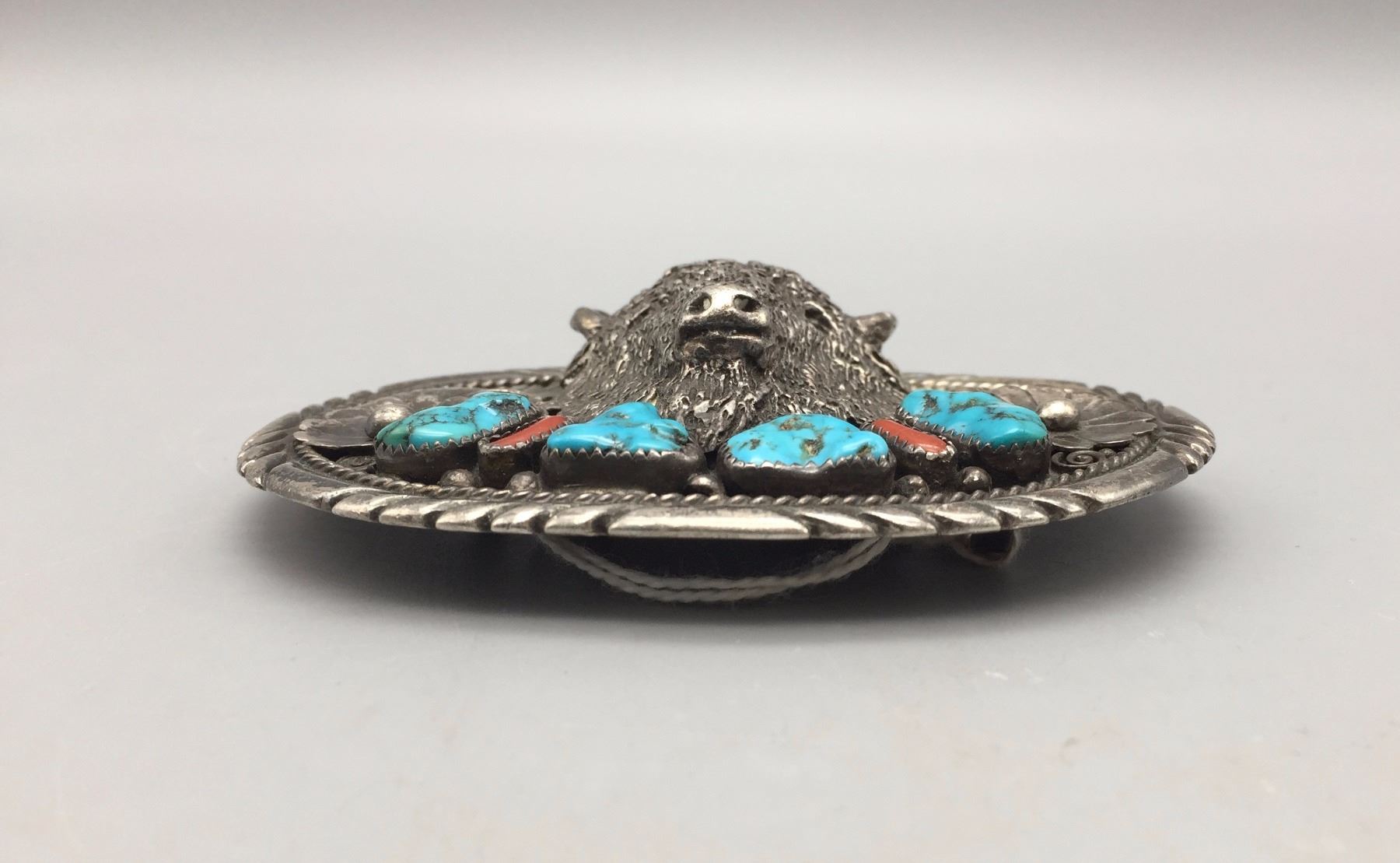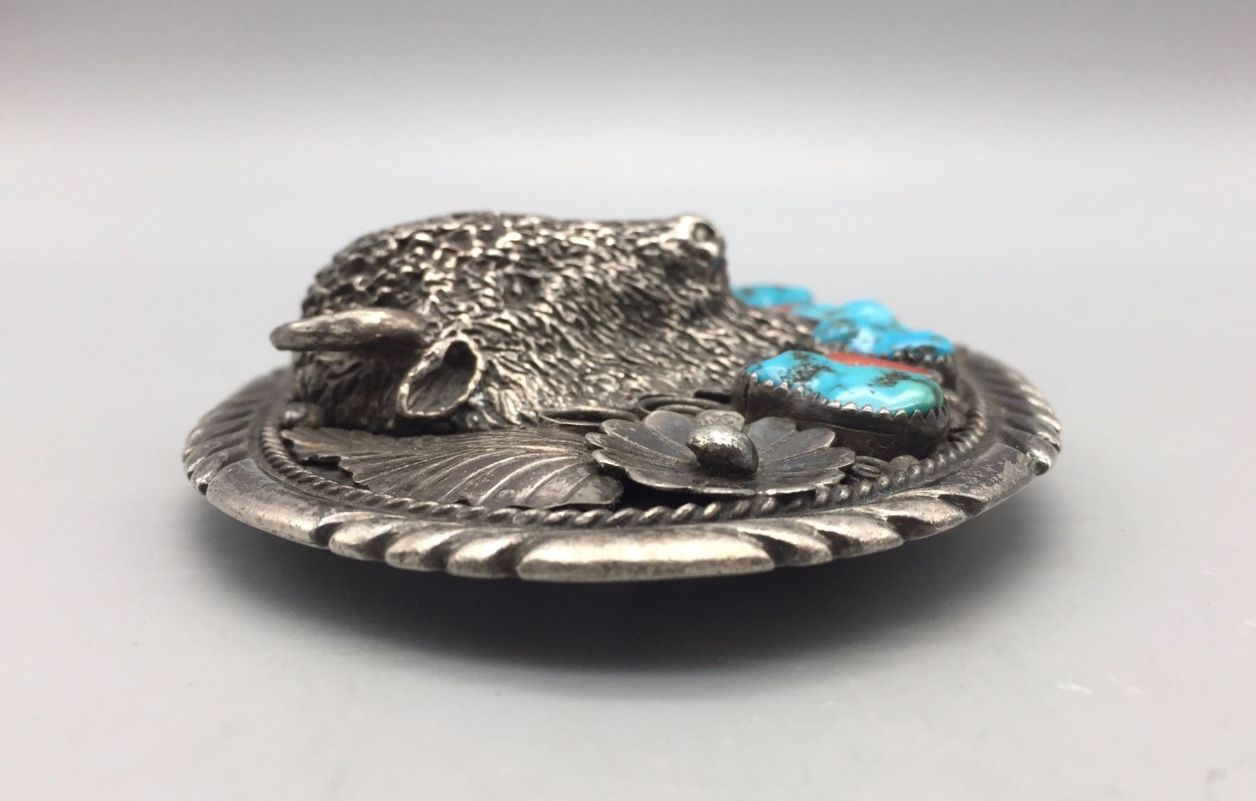 Description: Sterling silver belt buckle with coral and turquoise cabochons and a sterling buffalo head. Maker: Hallmarked, Lester Yazzie. Approx. Age: Vintage. Size: Buckle measures 4” l x 3” w. Weighs 120.3 g. Condition: Good for its age, normal wear expected. Please look closely at the pictures - they are an important part of our description. Shipping: There will be a $5 handling / packaging fee for shipping this lot. The actual cost of postage will be added on top of that.