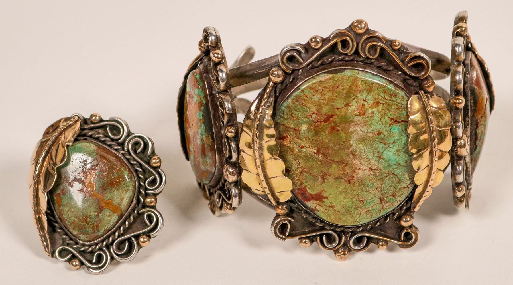 This vintage custom estate piece is Navajo made, the center stone measures at 2”x 2” in diameter and flanked by two other stones measuring about 1-1/4" by-1/2”, the leaf trim on the bracelet and ring is Gold but not certain on the Karat weight, sterling silver is also used as trim accent work, the turquoise is Manassa out of the King Mine in Colorado. Set