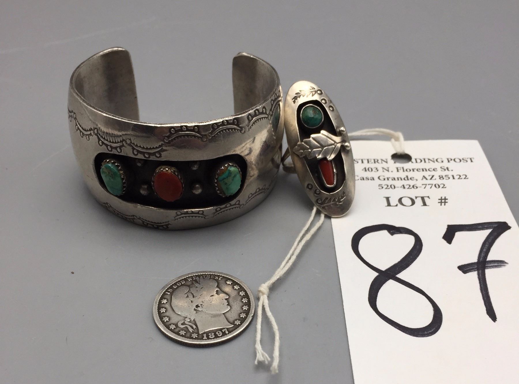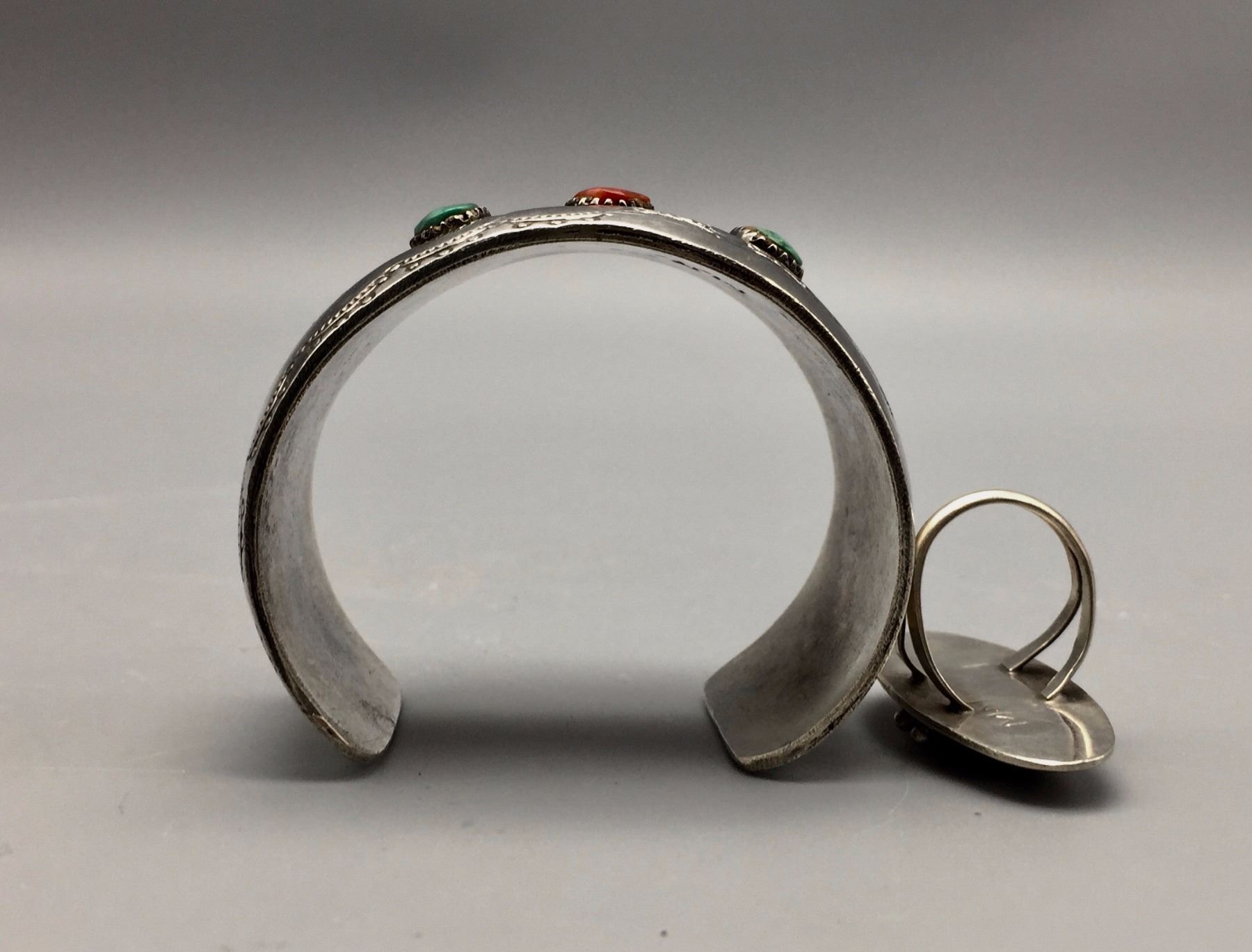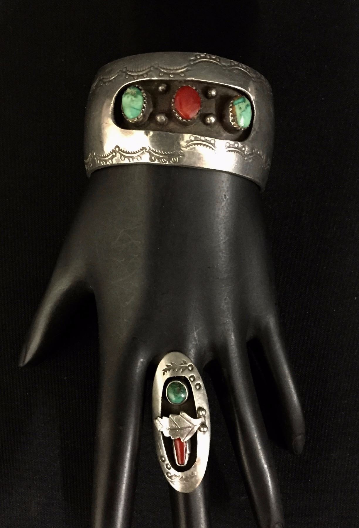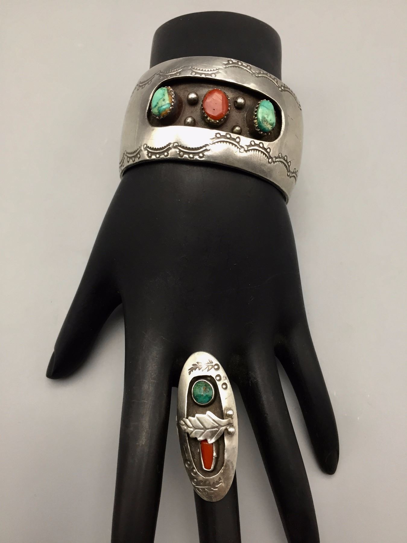 Maker: Various makers, appear to be vintage Navajo. Approx. Age: Vintage (Circa 1970s) Size: Bracelet measures 5” inside plus and additional 1 1/8” opening (fits 6 1/8” wrist). 1 1/4” at it’s widest. The ring is a size 6 1/2. Lot weighs 64.6 g. Additional Info: Vintage turquoise, coral and sterling silver shadowbox style bracelet and ring. Condition: Good for their age, normal wear expected. Please look closely at the pictures - they are an important part of our description. Shipping: There will be a $5 handling / packaging fee for shipping this lot. The actual cost of postage will be added on top of that.