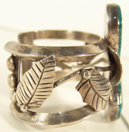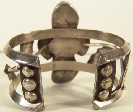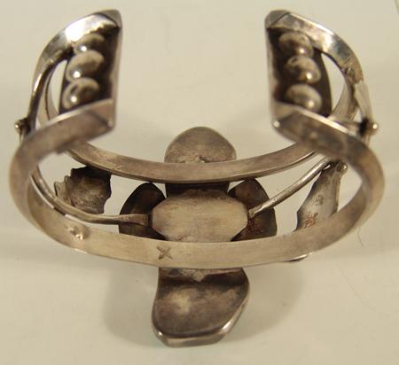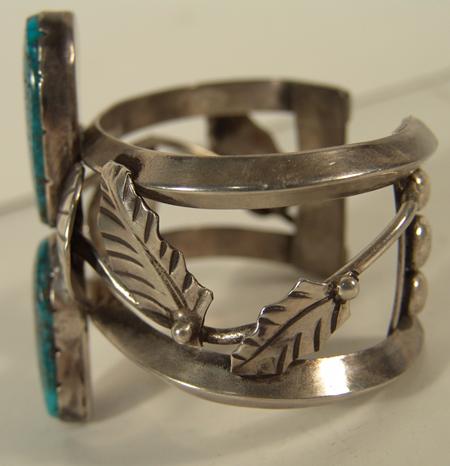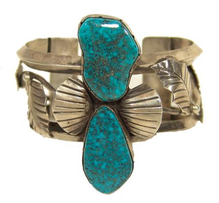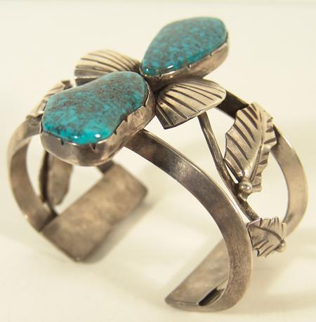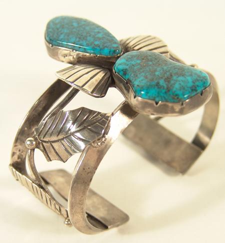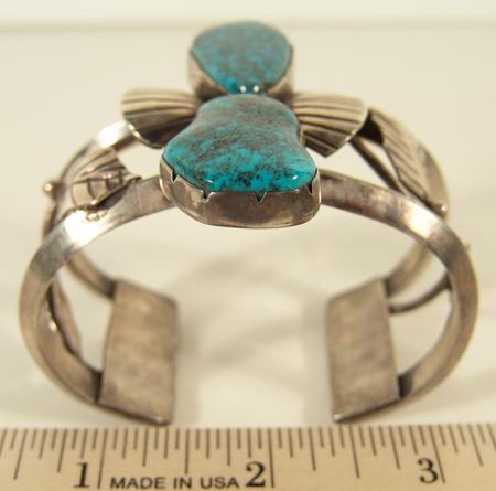 Classic two-stone heavy gauge silver bracelet with beautiful Lone Mountain spiderweb turquoise. Hallmarked with butterfly and crossed arrows. Purchased from the Old Corrales Trading Post, New Mexico in 1974 for $495.00. 6" plus 1" gap x 2-1/2" wide