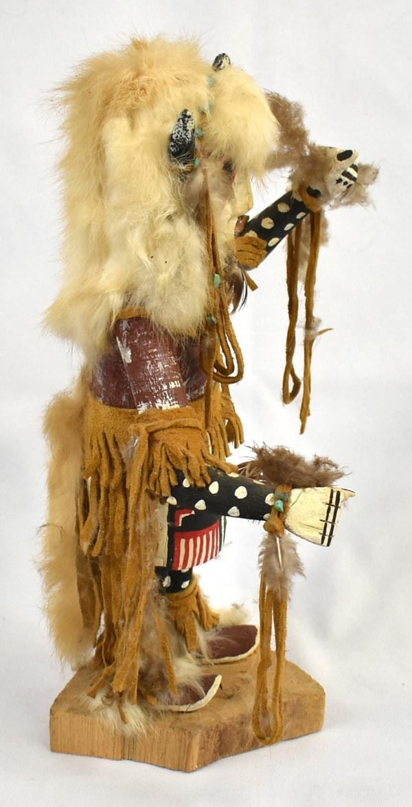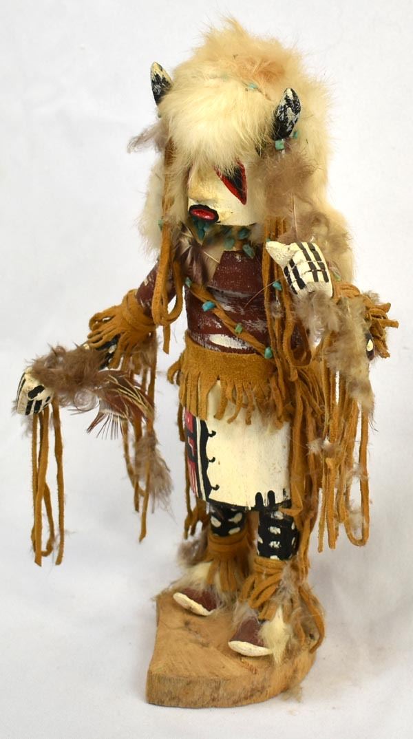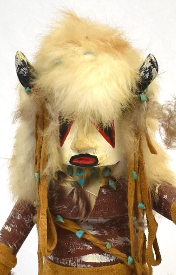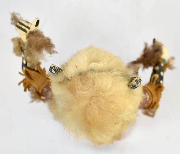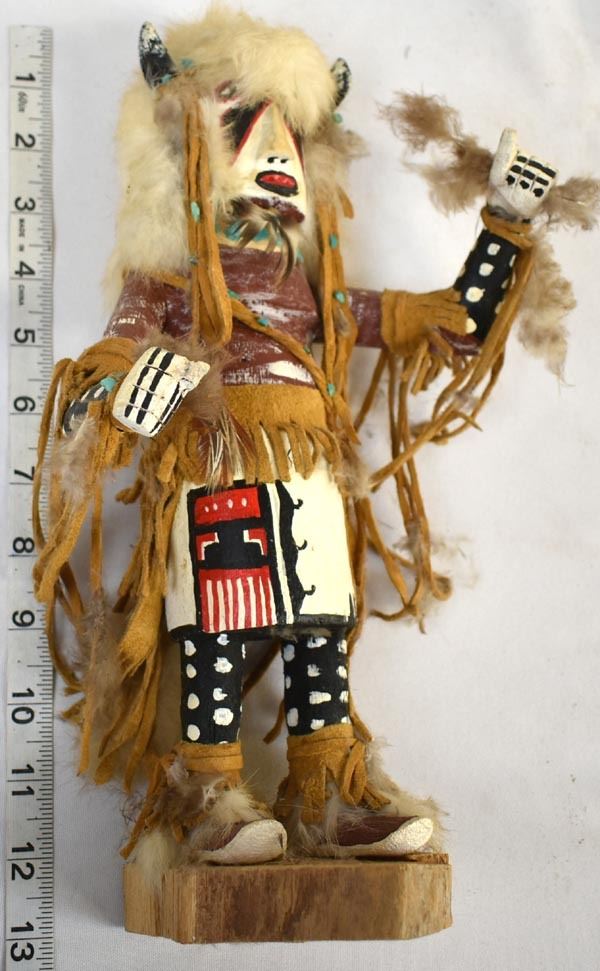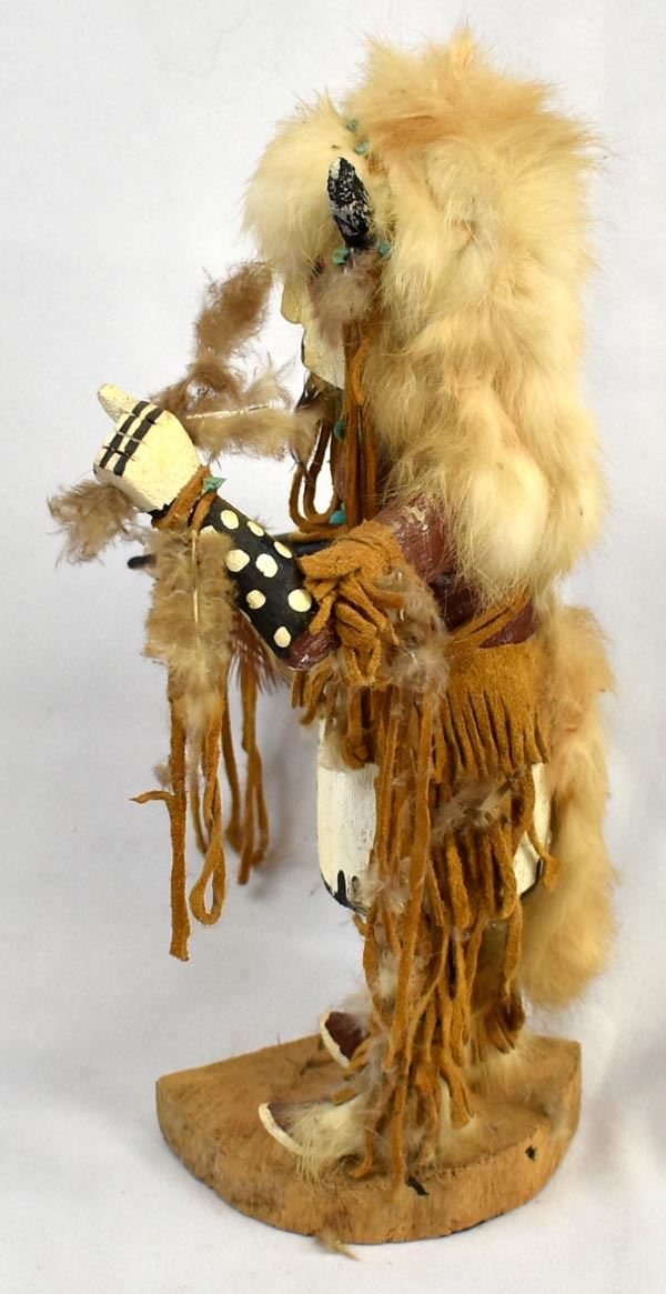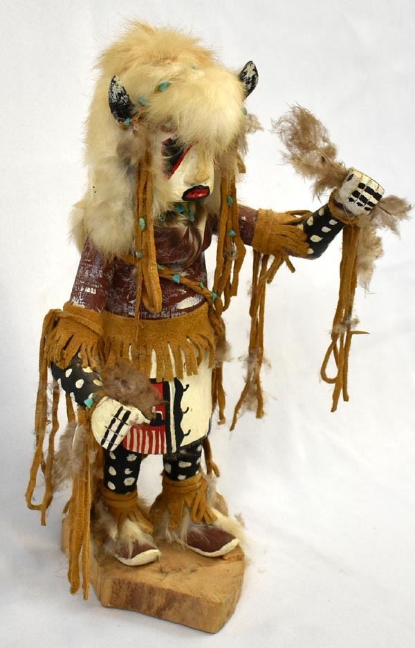 Vintage Native American Buffalo Dancer Kachina, measures 7'' x 12'' x 5'', embellished with rabbit fur, turquoise nuggets, shells, leather, beaded, and feathers, wood base is broken, ca. 1960s-1970s