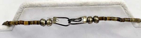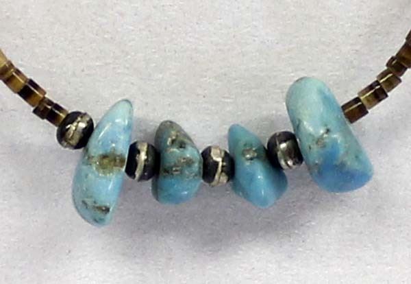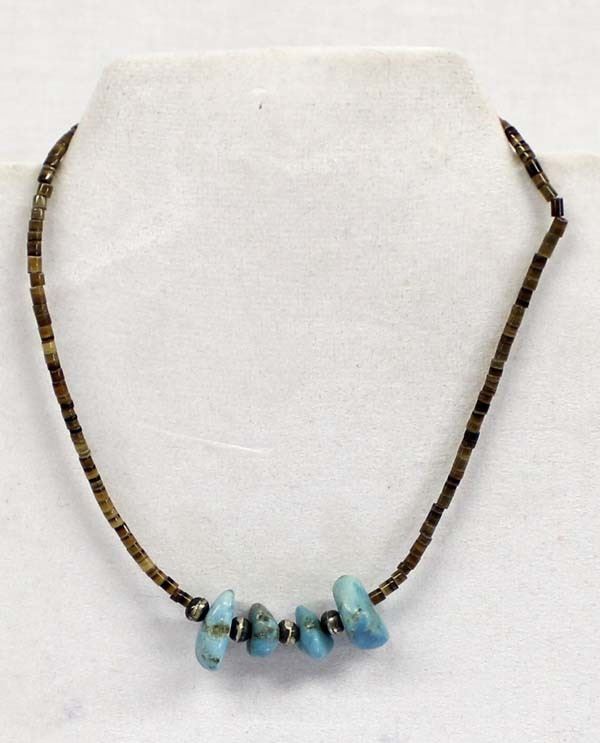 Vintage Native American Navajo Child's Turquoise Nugget Necklace, features 4 beautiful turquoise nuggets with the largest measuring 5/8''L, 8 sterling silver hollow beads, sterling clasp, and pen shell heishi, measures 10''L end to end