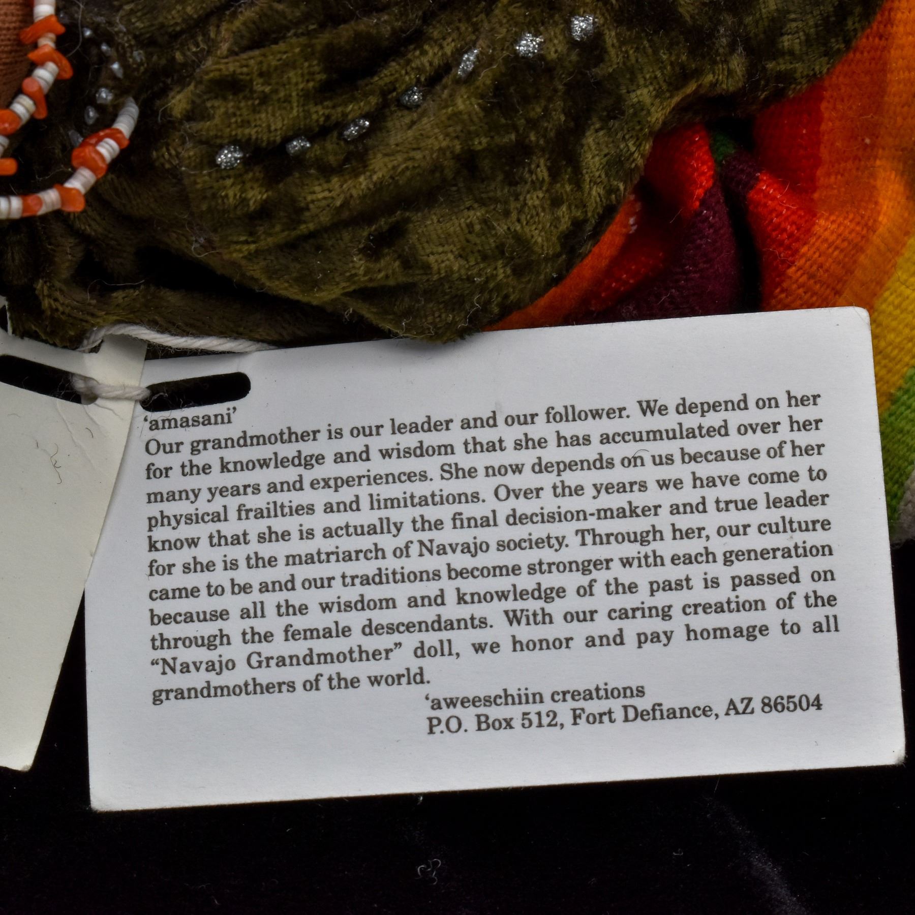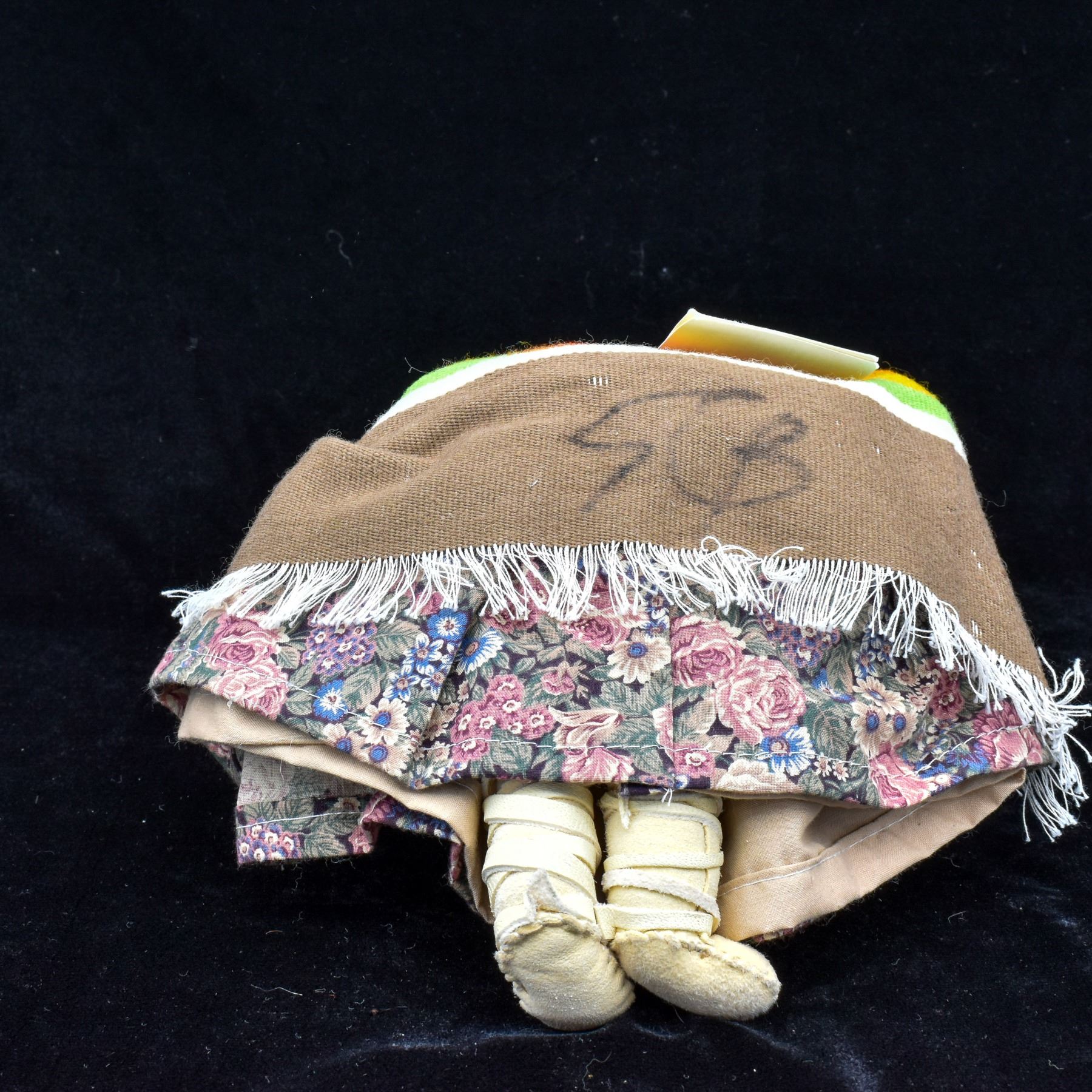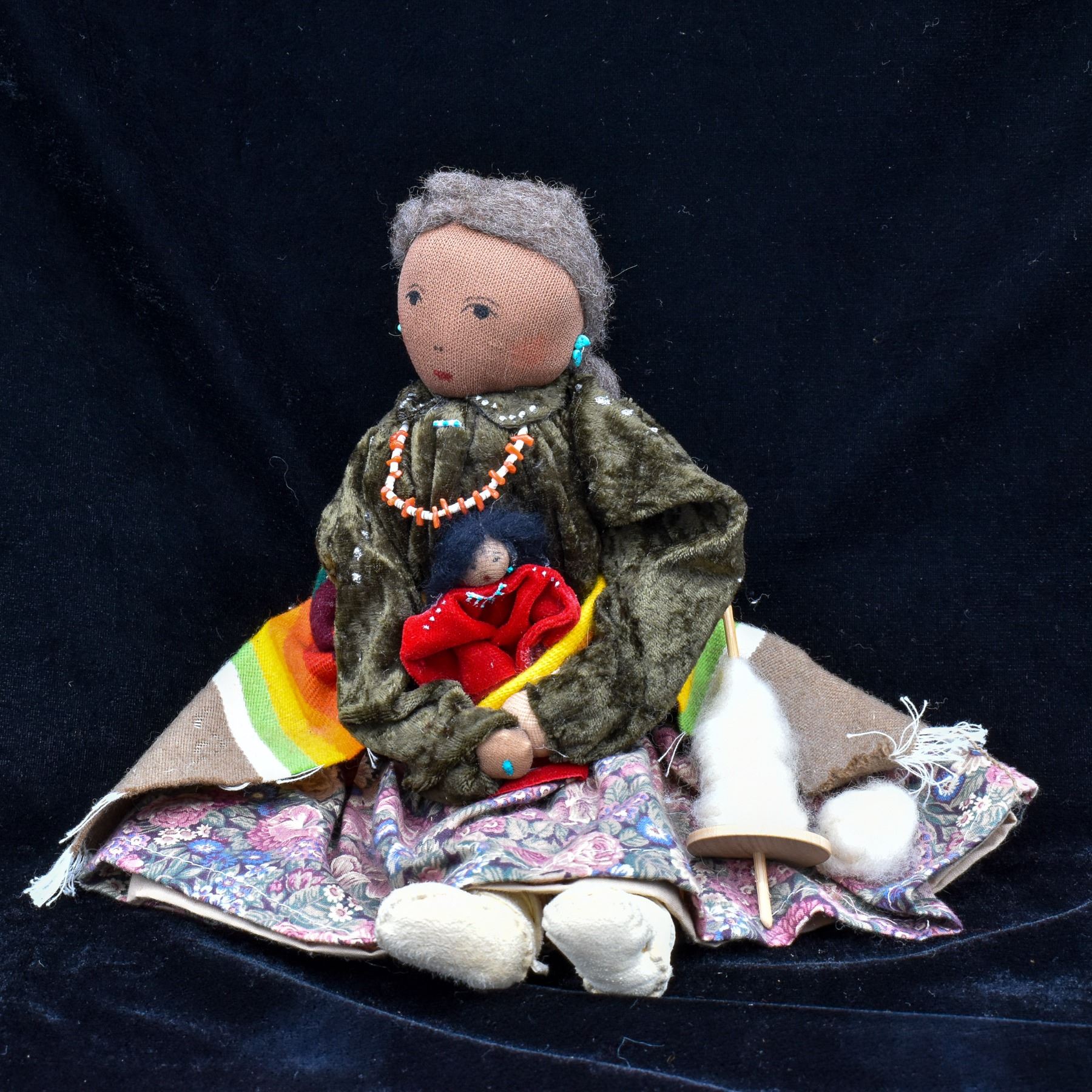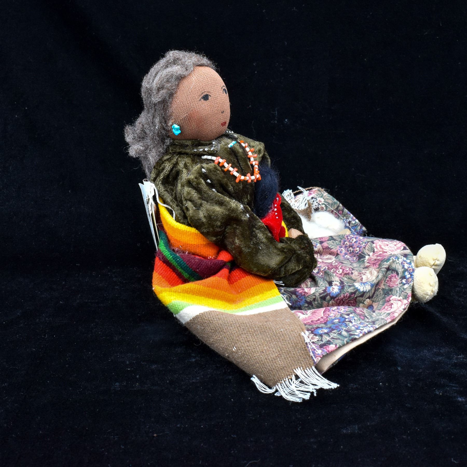 Vintage Native American Navajo Cloth Doll by Sylvia C. Begaye of Fort Defiance AZ, hand drawn face, leather moccasins, traditional dress, wearing shell heishi and coral nugget necklace, turquoise bead earrings, holding baby, measures 7'' x 8'' x 10'', has artist's initials on the bottom, she is noted for her wonderful hand crafted Navajo dolls