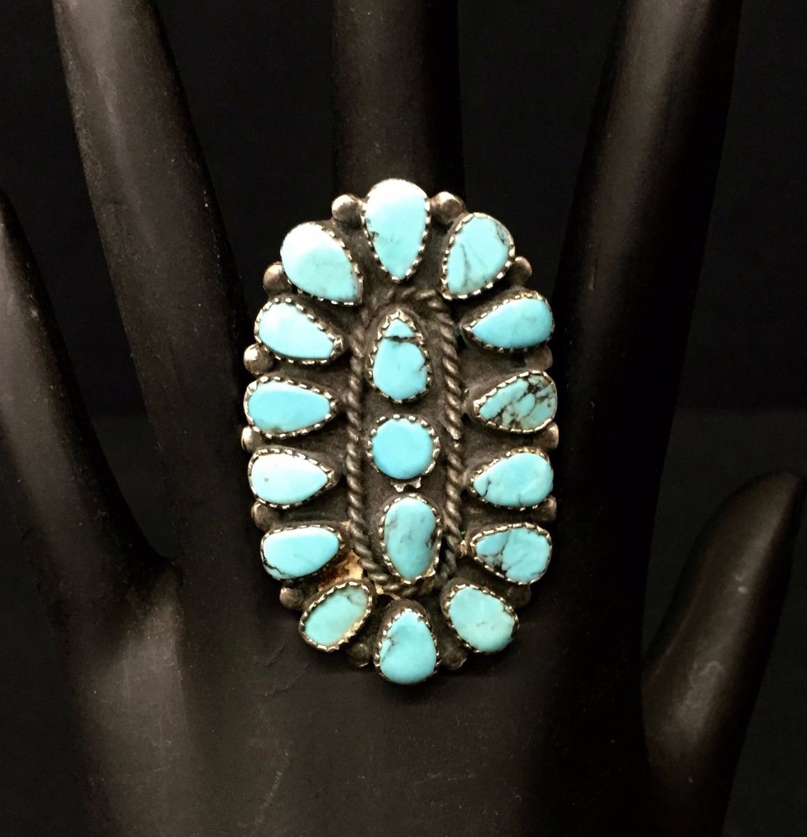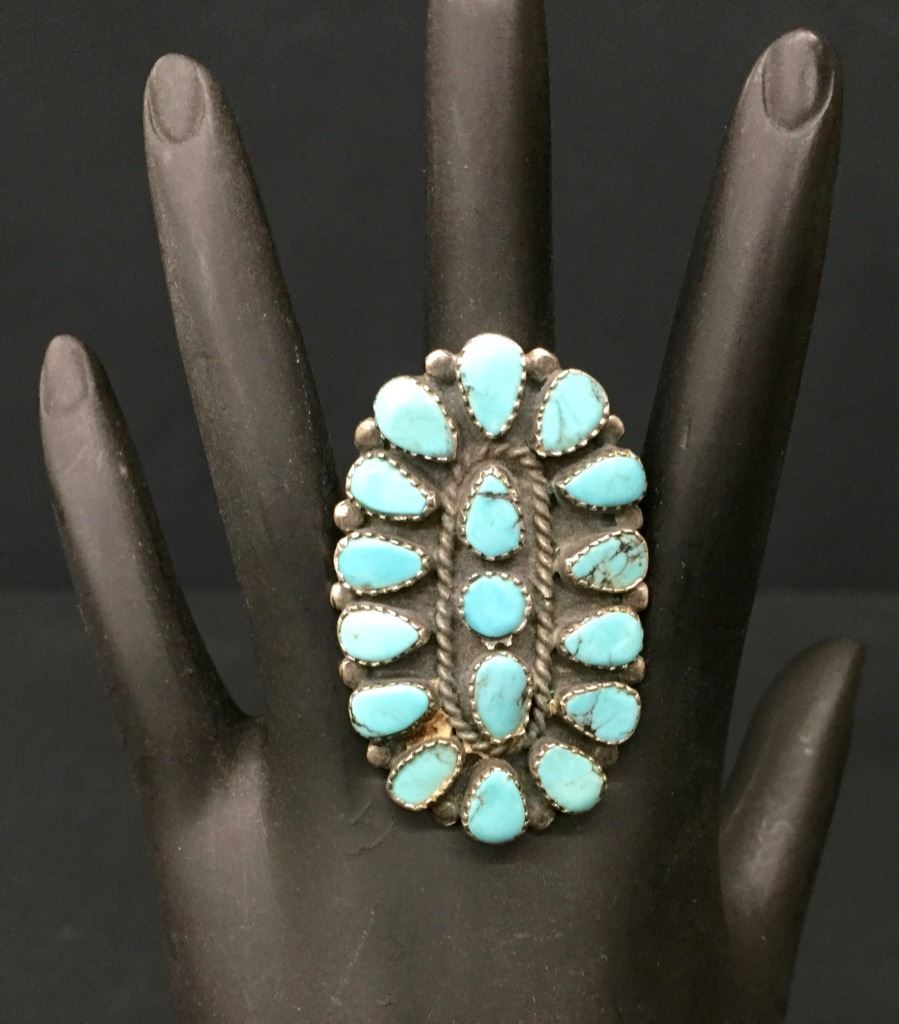 The ring is a size 10 and weighs 14.2 g. It is 1.75 inches long by 1.25 inches wide on the top part. Please look closely at pics - they are an important part of our description. Shipping: There will be a $5 handling / packaging fee for shipping this lot. The actual cost of postage will be added on top of that.