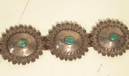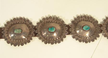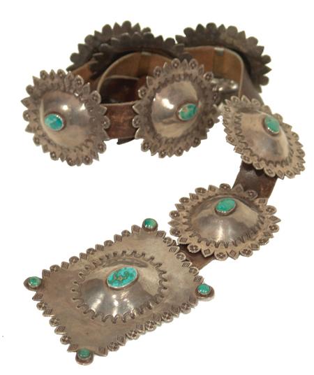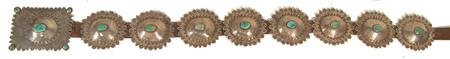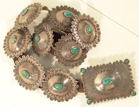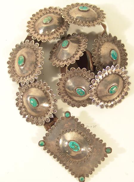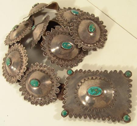 Early hand wrought all-silver belt. Each of the eight conchos and matching buckle set with a single turquoise stone (some broken from wear) and stamped with floral and diamond designs. Classic. 28" - 36" x 2-3/4" wide