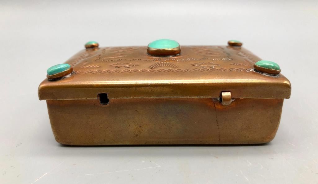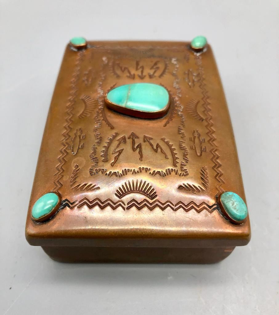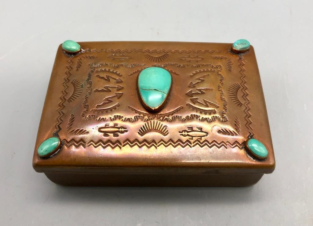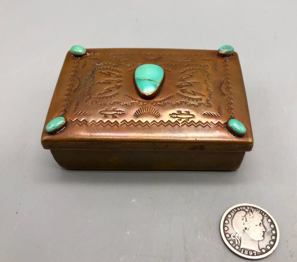 Presented for sale in this lot is a vintage Navajo copper box with turquoise and hand stamped designs. This is a neat box that has five turquoise stones on top. It also features hand stamped designs across the lid that are similar to the Fred Harvey Era designs. MAKER: Unmarked. APPROX AGE: Vintage. SIZE: 3-1/4 inches wide X 1 inches tall X 1 inches deep. Weighs 124.4 grams. CONDITION: Good for its age, normal wear expected. Please look closely at the pictures as they are an important part of our description and are hereby incorporated into the description, specifically with regards to condition. SHIPPING: There will be a $5 handling / packaging fee for shipping this lot. The actual cost of postage will be added on top of that. BUY IT NOW: If you would like to buy this item now, without waiting for the auction day to bid on it, we do offer this option (which is available up to 48 hours before the actual auction starts). The “Buy it Now†price is the high estimate of this lot (plus applicable fees and the Buyer's premium is discounted to 10% when using the Buy it Now option). If you would like to exercise this option, you must contact us by email (or phone as long as you talk to someone live). Reference this lot number and your intention to "Buy it Now."