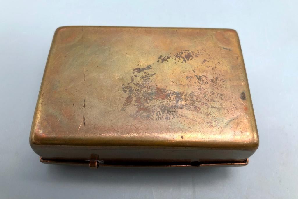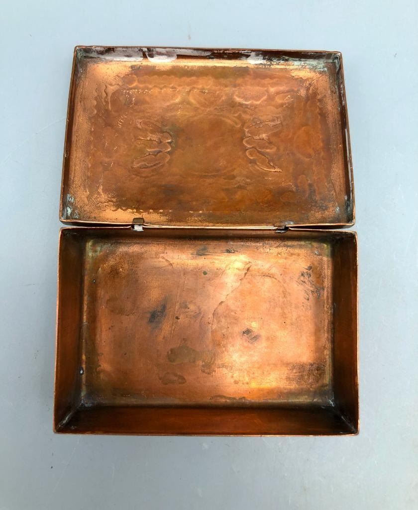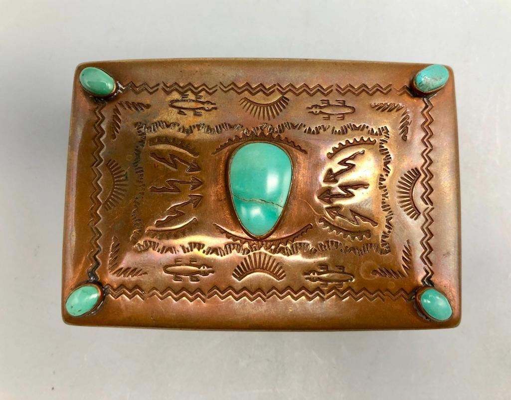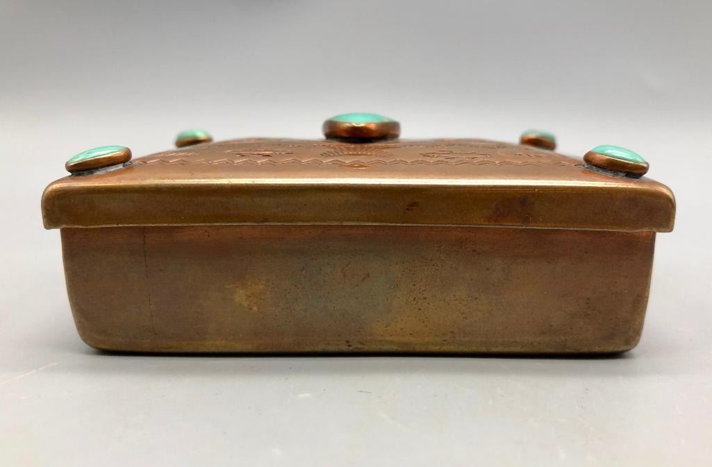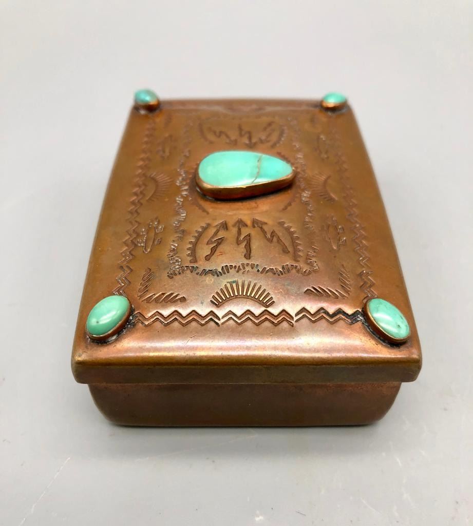 Presented for sale in this lot is a vintage Navajo copper box with turquoise and hand stamped designs. This is a neat box that has five turquoise stones on top. It also features hand stamped designs across the lid that are similar to the Fred Harvey Era designs. MAKER: Unmarked. APPROX AGE: Vintage. SIZE: 3-1/4 inches wide X 1 inches tall X 1 inches deep. Weighs 124.4 grams. CONDITION: Good for its age, normal wear expected. Please look closely at the pictures as they are an important part of our description and are hereby incorporated into the description, specifically with regards to condition. SHIPPING: There will be a $5 handling / packaging fee for shipping this lot. The actual cost of postage will be added on top of that. BUY IT NOW: If you would like to buy this item now, without waiting for the auction day to bid on it, we do offer this option (which is available up to 48 hours before the actual auction starts). The “Buy it Now†price is the high estimate of this lot (plus applicable fees and the Buyer's premium is discounted to 10% when using the Buy it Now option). If you would like to exercise this option, you must contact us by email (or phone as long as you talk to someone live). Reference this lot number and your intention to "Buy it Now."