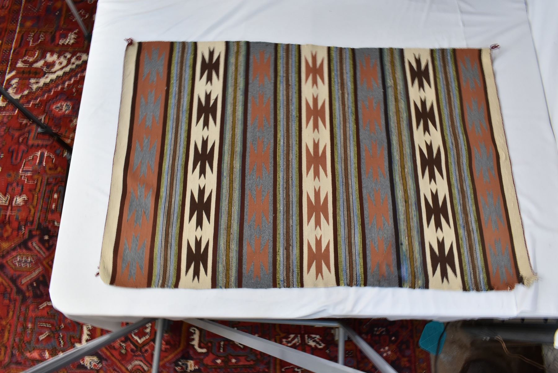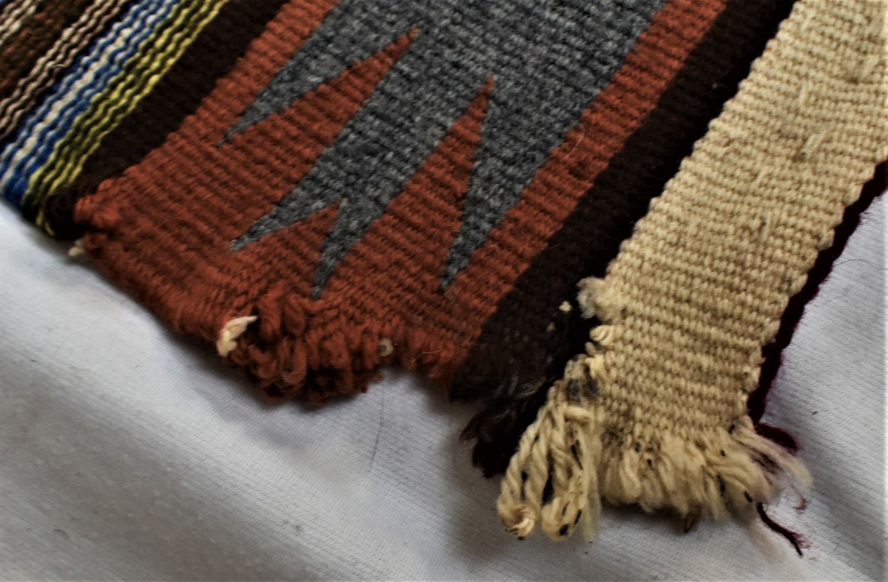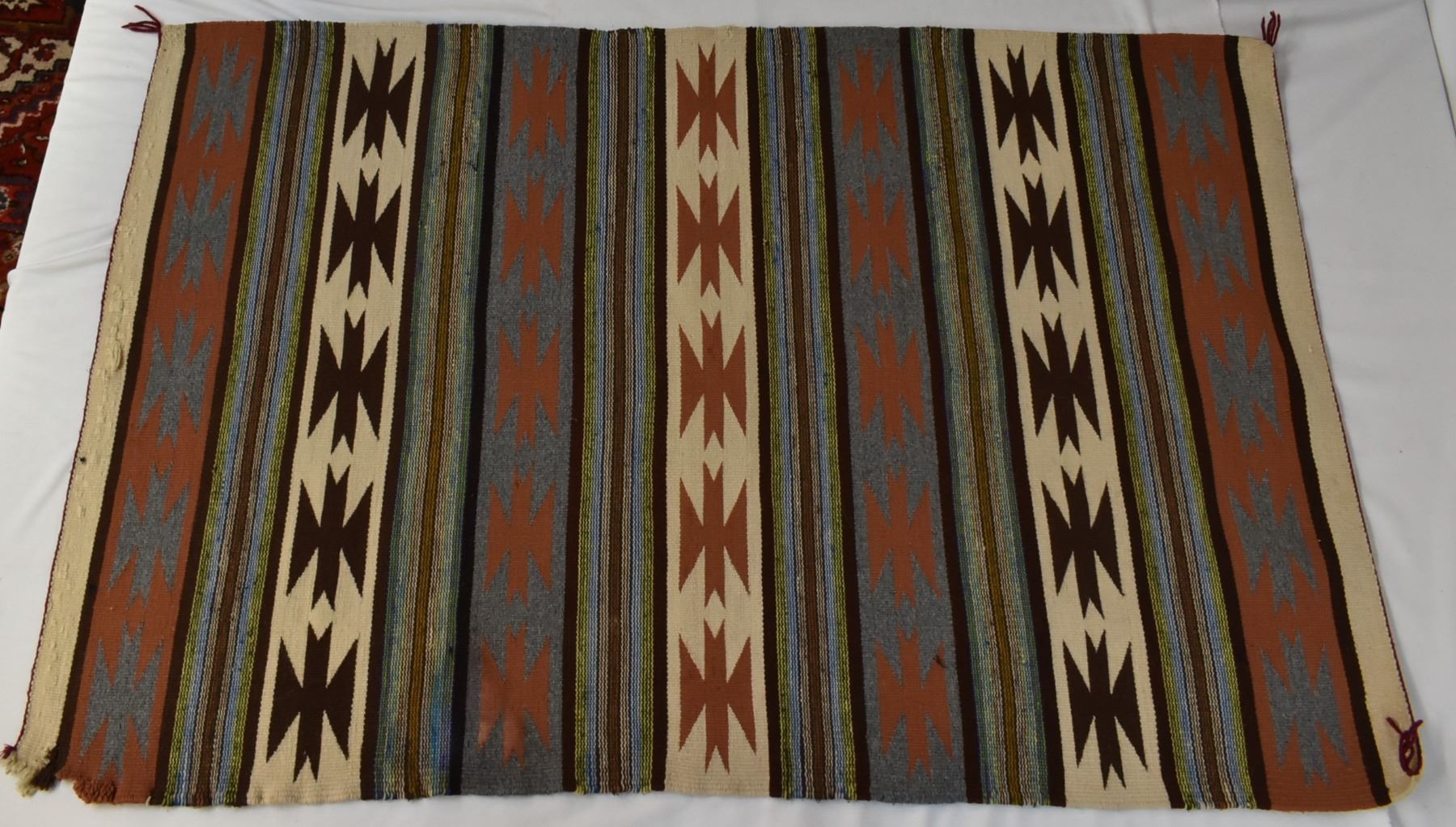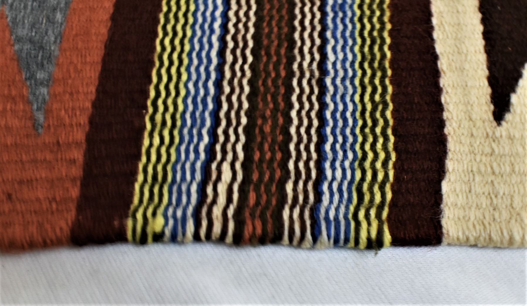 Vintage Native American Navajo Crystal Wool Textile Rug, measures 48'' x 32'', some selvage damage, 3 tassels intact, beautiful colors in a tight weave