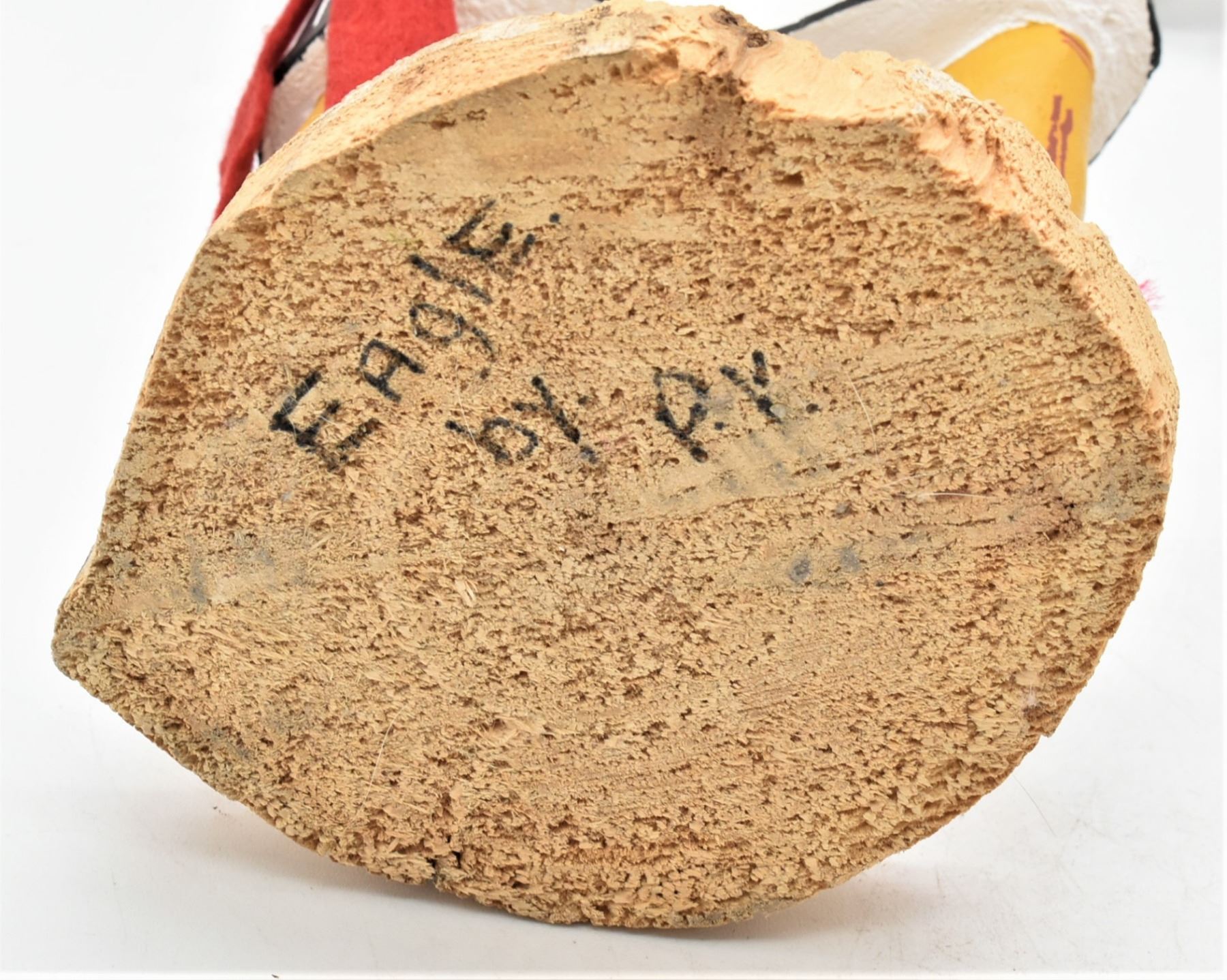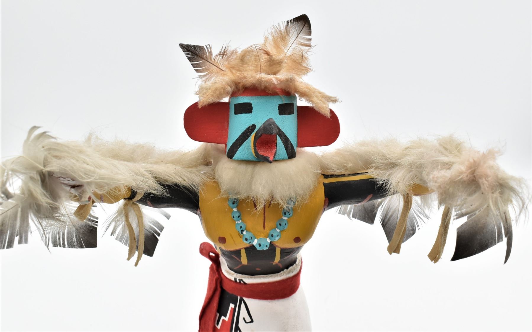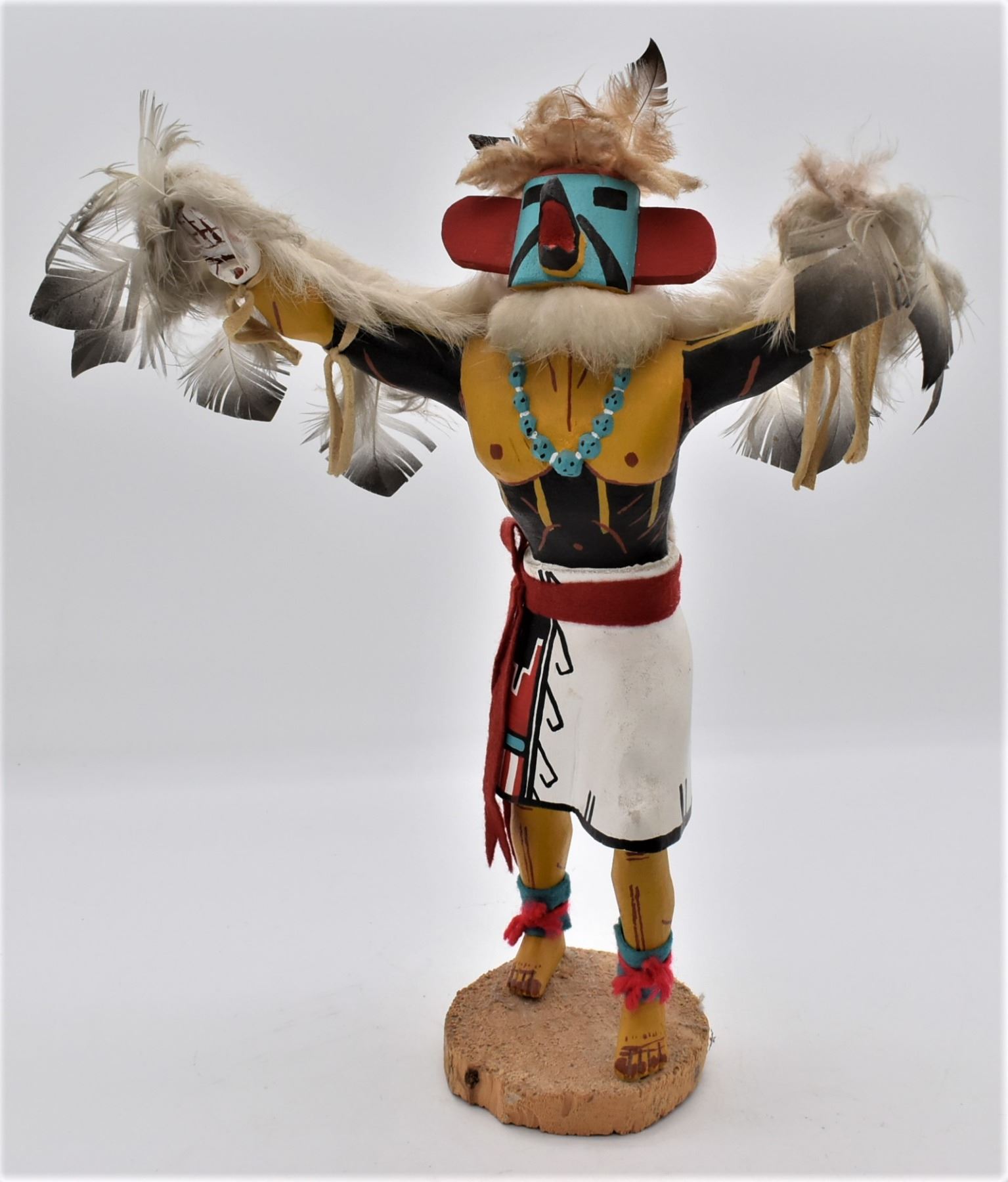 Vintage Navajo Eagle Dancer Kachina, artist's initials P.Y. on the bottom, embellished with feather, leather, felt, and yarn