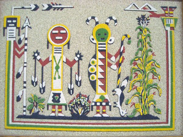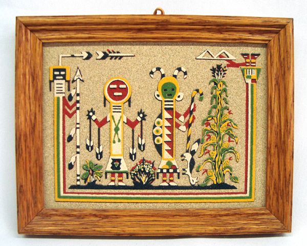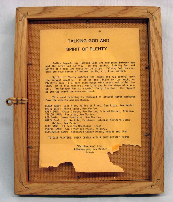 Vintage Navajo Framed Sand Painting. The piece is entitled ''Talking God and Spirit of Plenty''. There's considerable information on the back of the piece which gives the source of the various colors of sand along with all the symbolism the Navajos incorporated in their art.