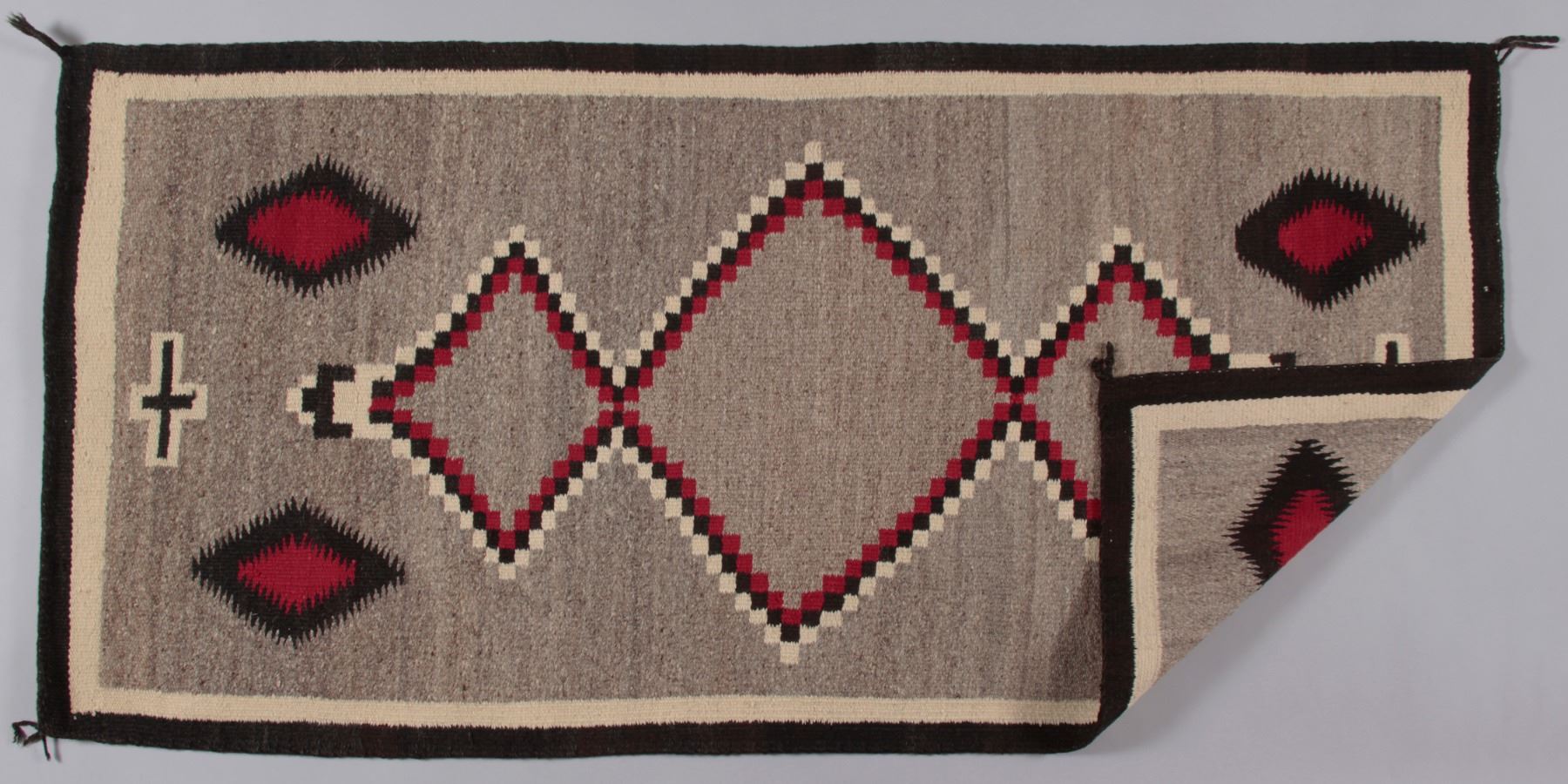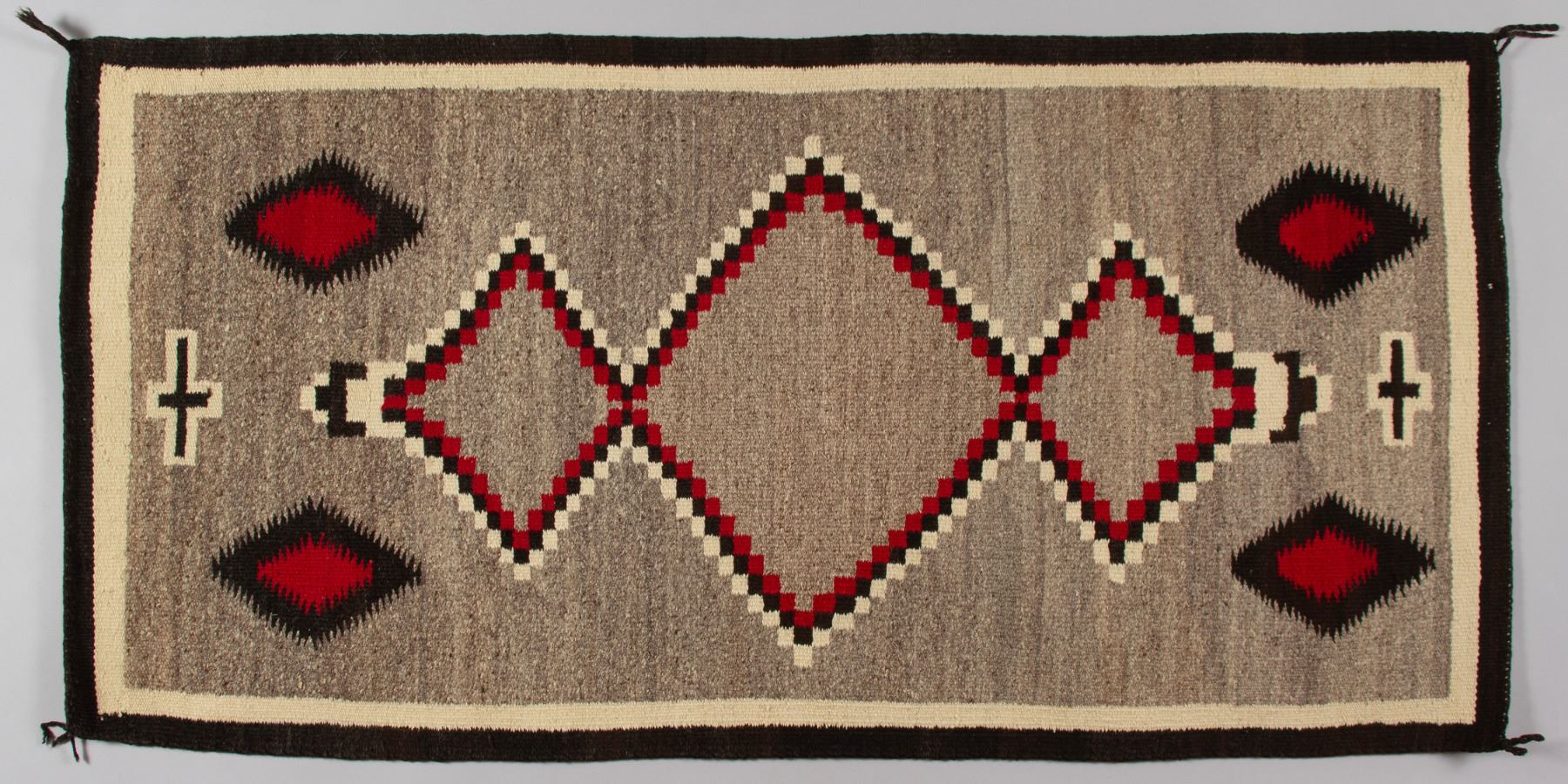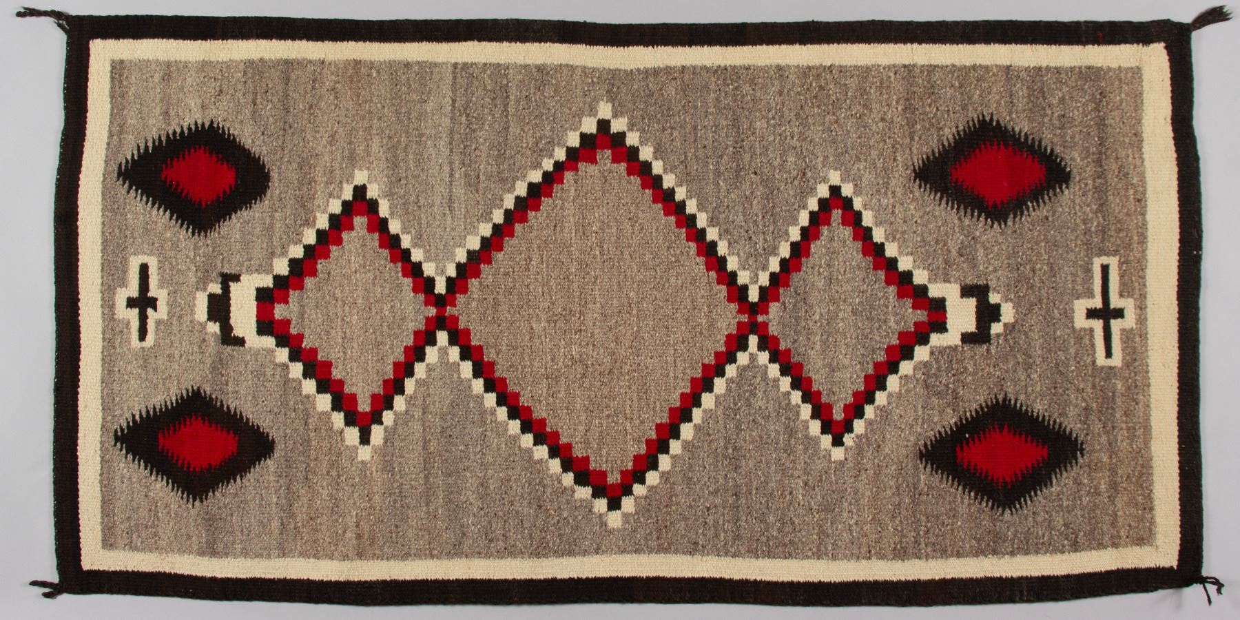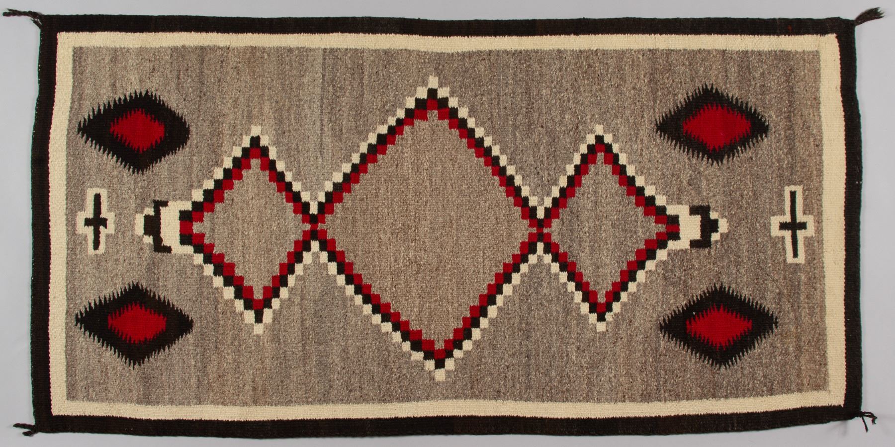 Navajo Ganado Rug featuring bold, central serrated diamonds (terraced diamonds) that are typical of traditional patterns, sometimes symbolizing mountains or the four sacred mountains of the Navajo people. Flanking the central motifs are small, white-outlined cross symbols, which are a traditional motif representing Spider Woman (Na'ashjé'íí Asdzáán), a significant deity in Navajo mythology who taught the people the art of weaving. The colors include a rich, dominant red, natural grey/brown, black, and natural white/cream banding. The tight weave and sturdy construction make this a durable textile suitable for floor use or as a wall hanging.