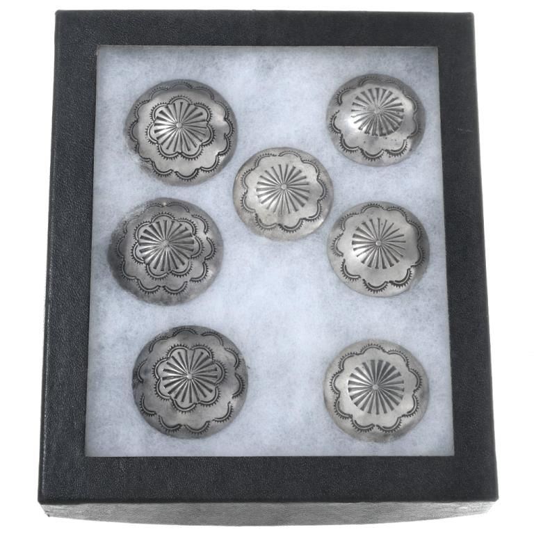 Conchos. This rare handmade set of Navajo buttons are crafted from Sterling Silver and are 1-1/4” wide to 1-3/8” wide. The set includes 7 buttons and these are circa 1950’s.