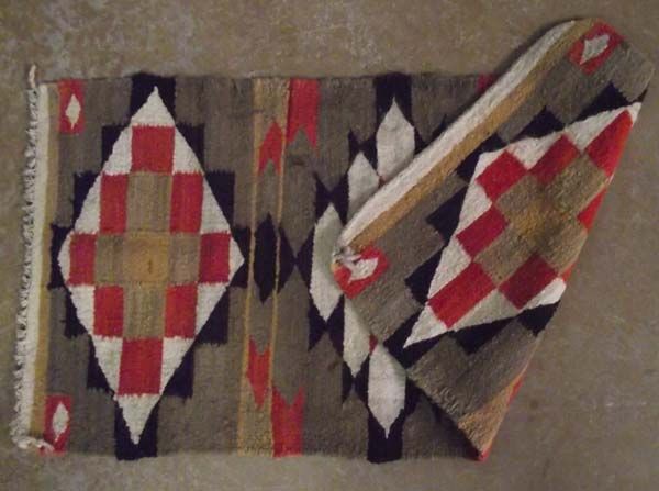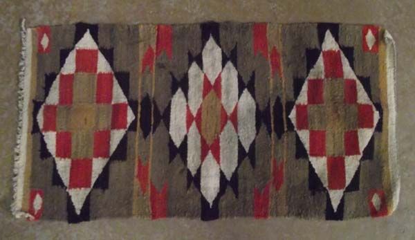 Vintage Pre-1970's Navajo Hand Spun Wool Rug, early Saltillo design with unusual color combination, rug measures 19.5'' x 38'', one small rub mark on back, fringed and has 4 cornered tassels.