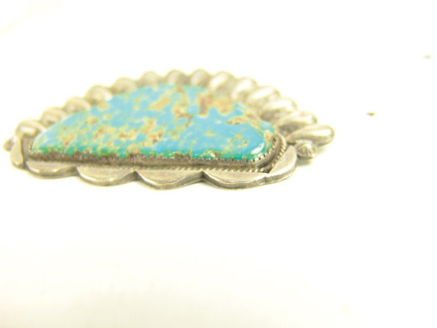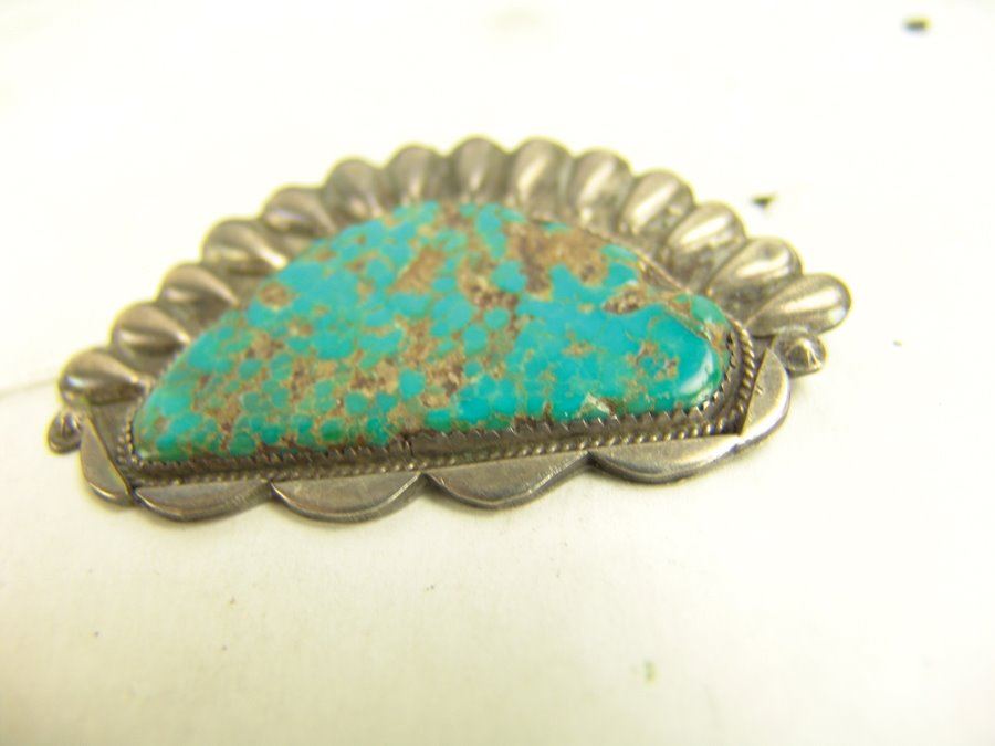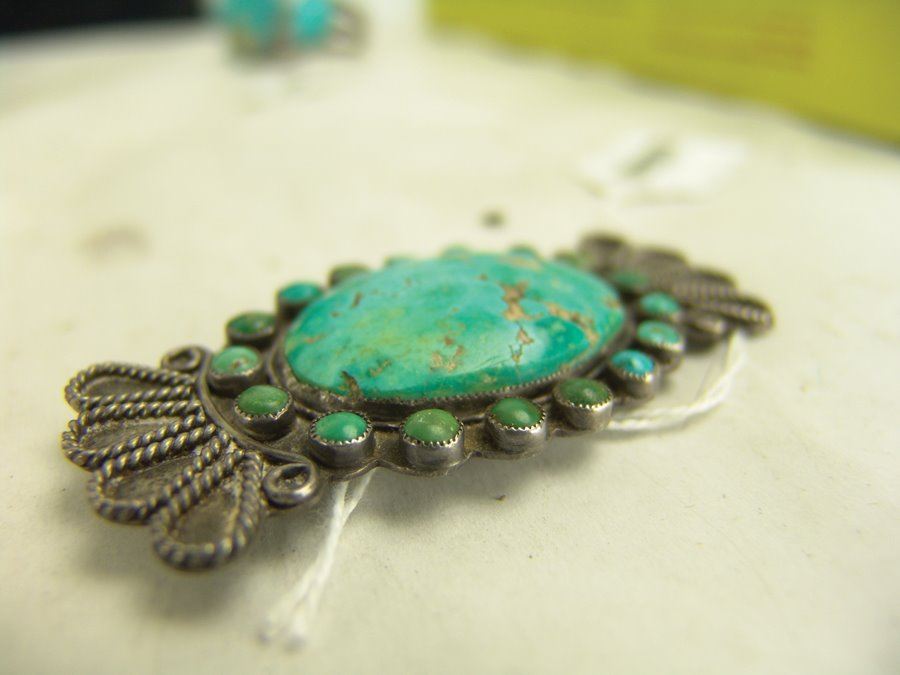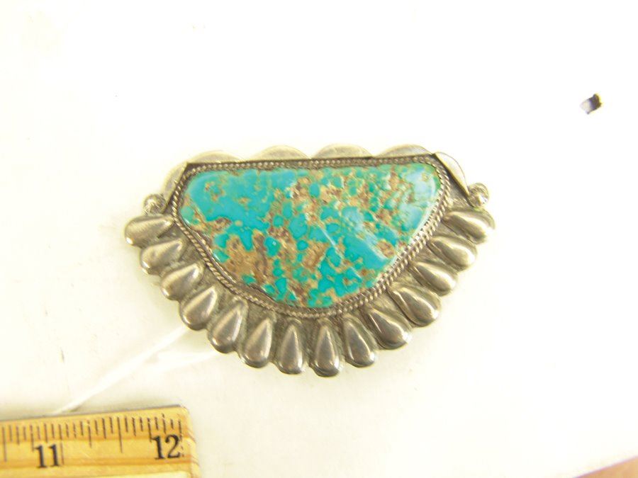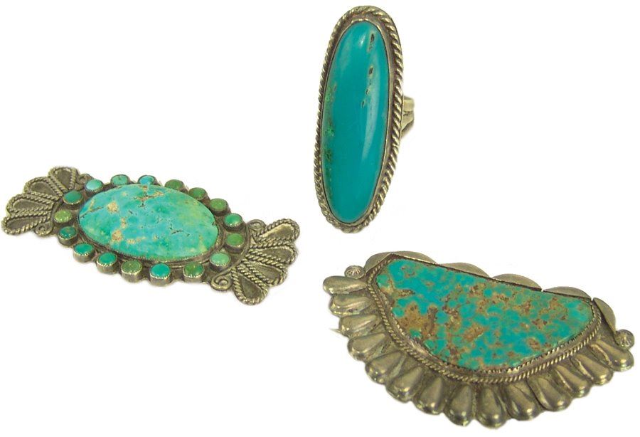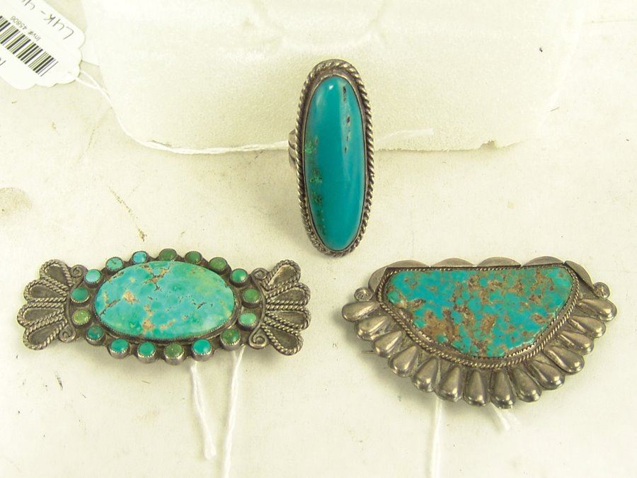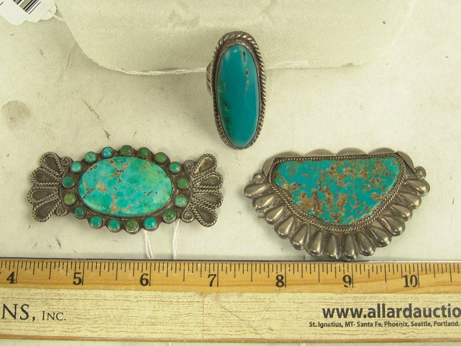 Group of three early pieces done in silver including two, hand wrought blouse pins with large turquoise stones that are 3" wide, plus a similar 2-1/4 long, size 10 ring. Good used condition, unsigned.,,Various