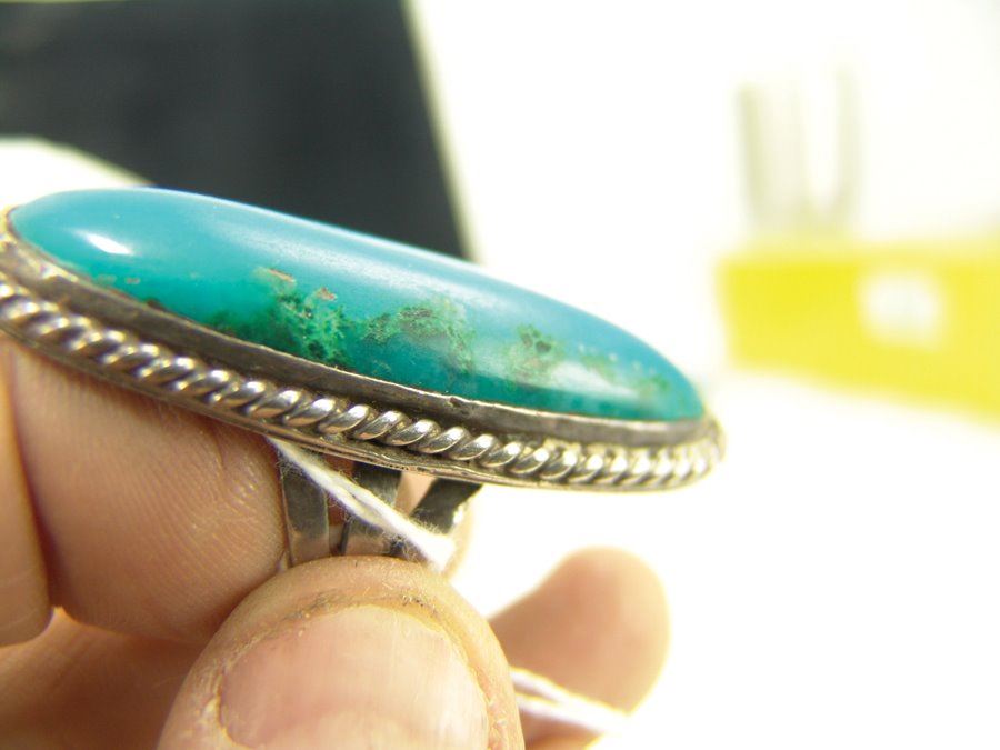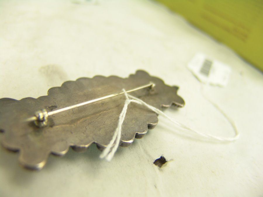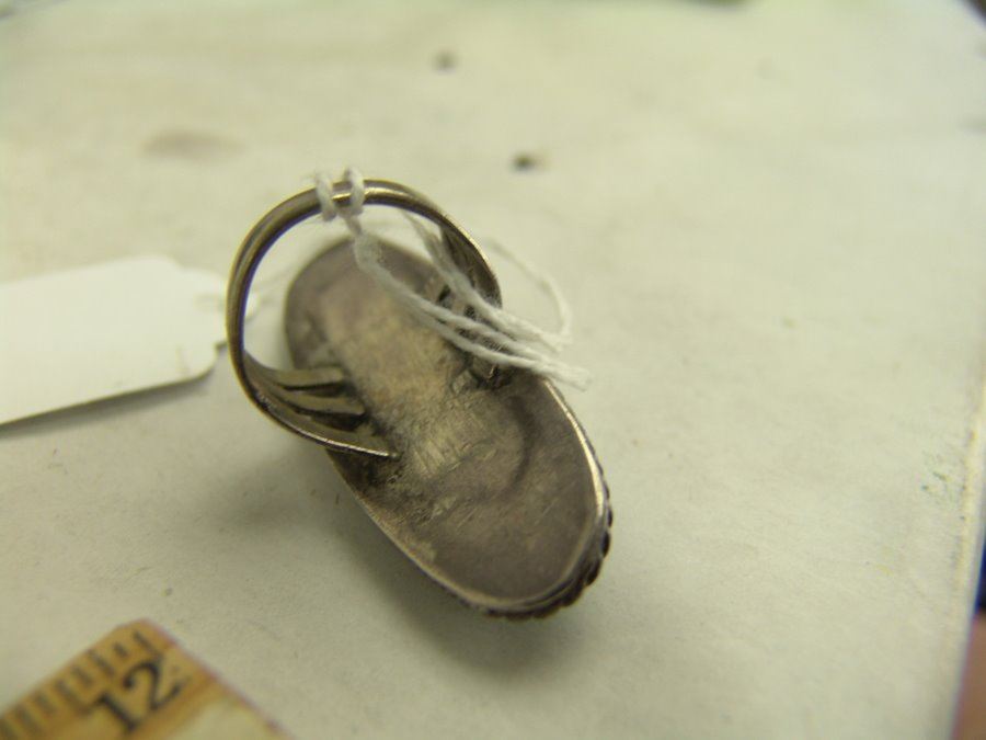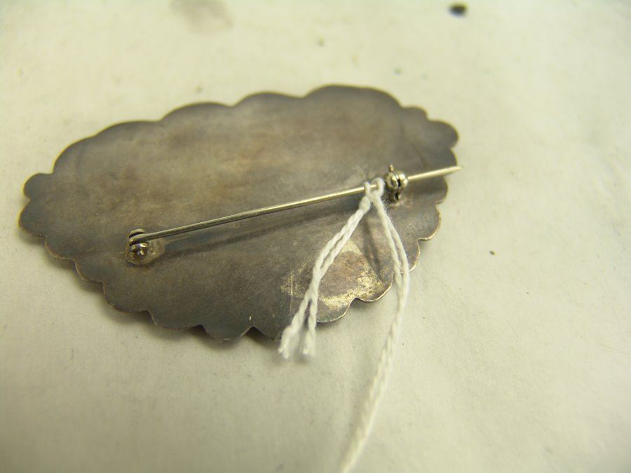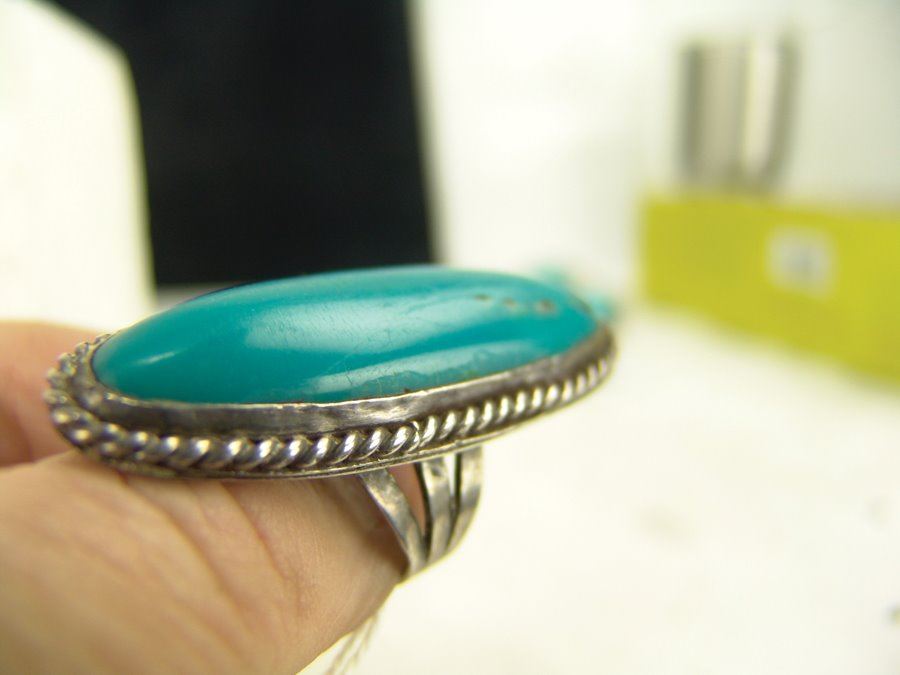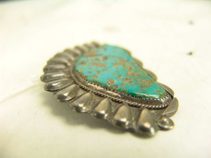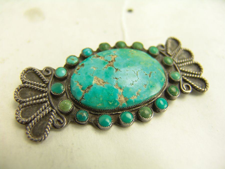 Group of three early pieces done in silver including two, hand wrought blouse pins with large turquoise stones that are 3" wide, plus a similar 2-1/4 long, size 10 ring. Good used condition, unsigned.,,Various