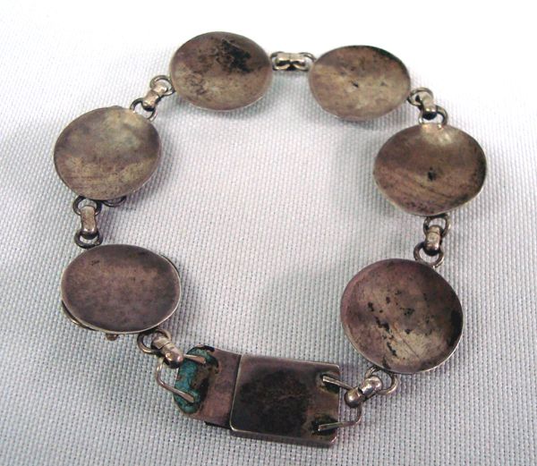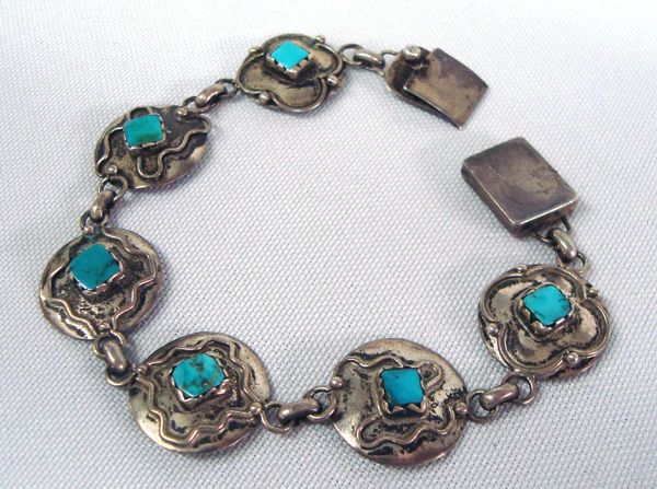 Vintage Navajo Link Bracelet, Silver & Turquoise. Six links using silver wire designs and set with square cut turquoise cabochons. Measures 7'' with a box clasp. Nice old Native American craftsmanship.