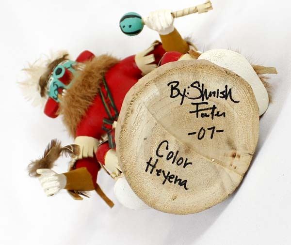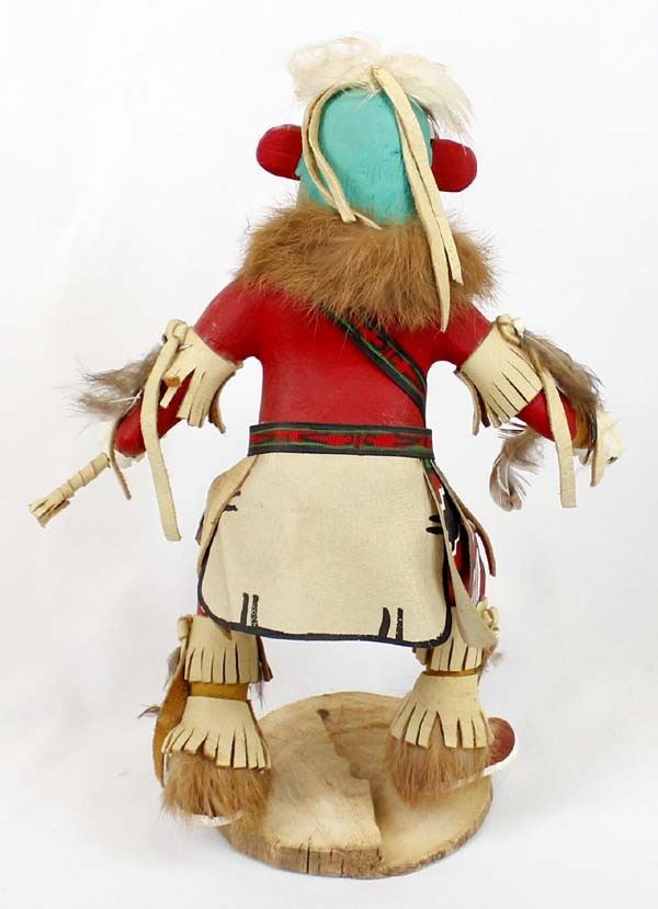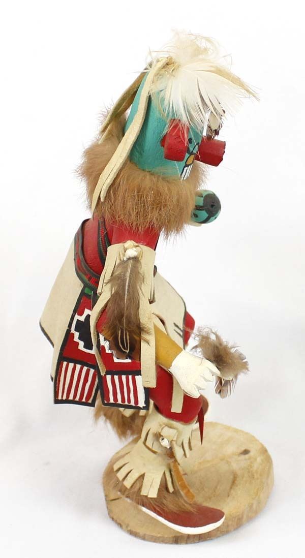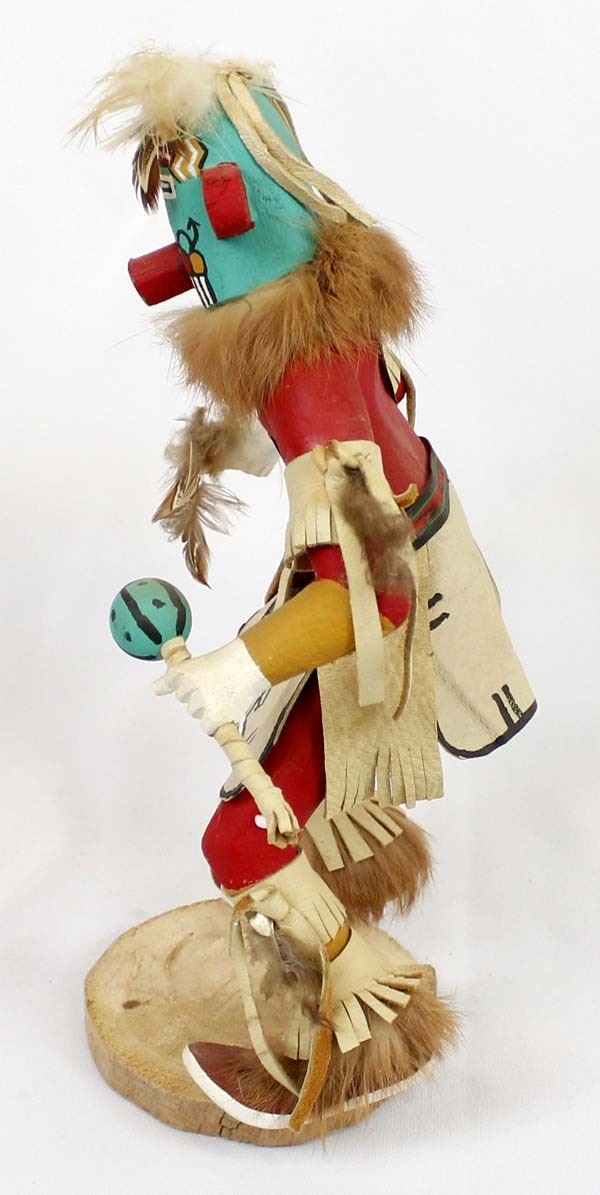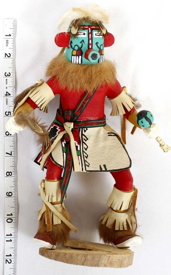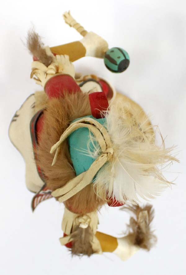 Vintage Native American Navajo Morning Singer Kachina by S. Foster, measures 11''H x 8.5''W x 4.5''Deep and is signed on the bottom, embellished with fur, feathers, ribbon, leather, and shells