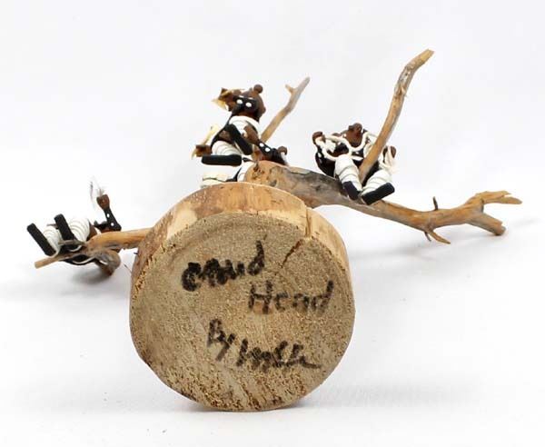 Vintage Native American Navajo Mud Head Kachina Tree, measures 9'' x 11'' x 6'' and is signed on the bottom, embellished with leather, feathers, twine, and cloth