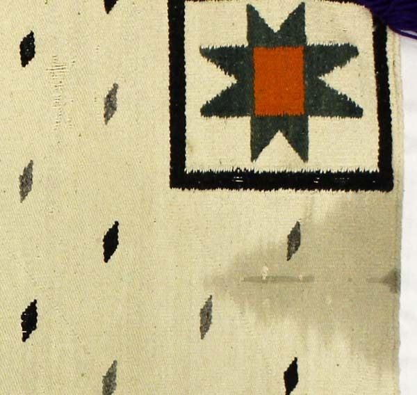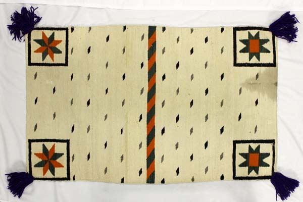 Vintage Native American Navajo Parade Saddle Blanket, measures 29'' x 50'', normal wear and tear for age, does have damage (i.e. holes and pulled threads) which do not take away from the beauty of this blanket, 4 large corner tassels, there four 8 point stars on this textile
