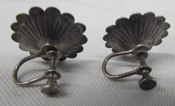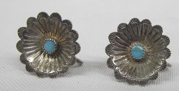 Vintage Navajo Pawn Earrings, Sterling & Turquoise. Stamped flower shape with small turquoise cabochon set in the middle. They measure 3/4'' in diameter. Screw back and stamped ''Sterling''. Sweet pair of vintage Navajo craftmanship,.