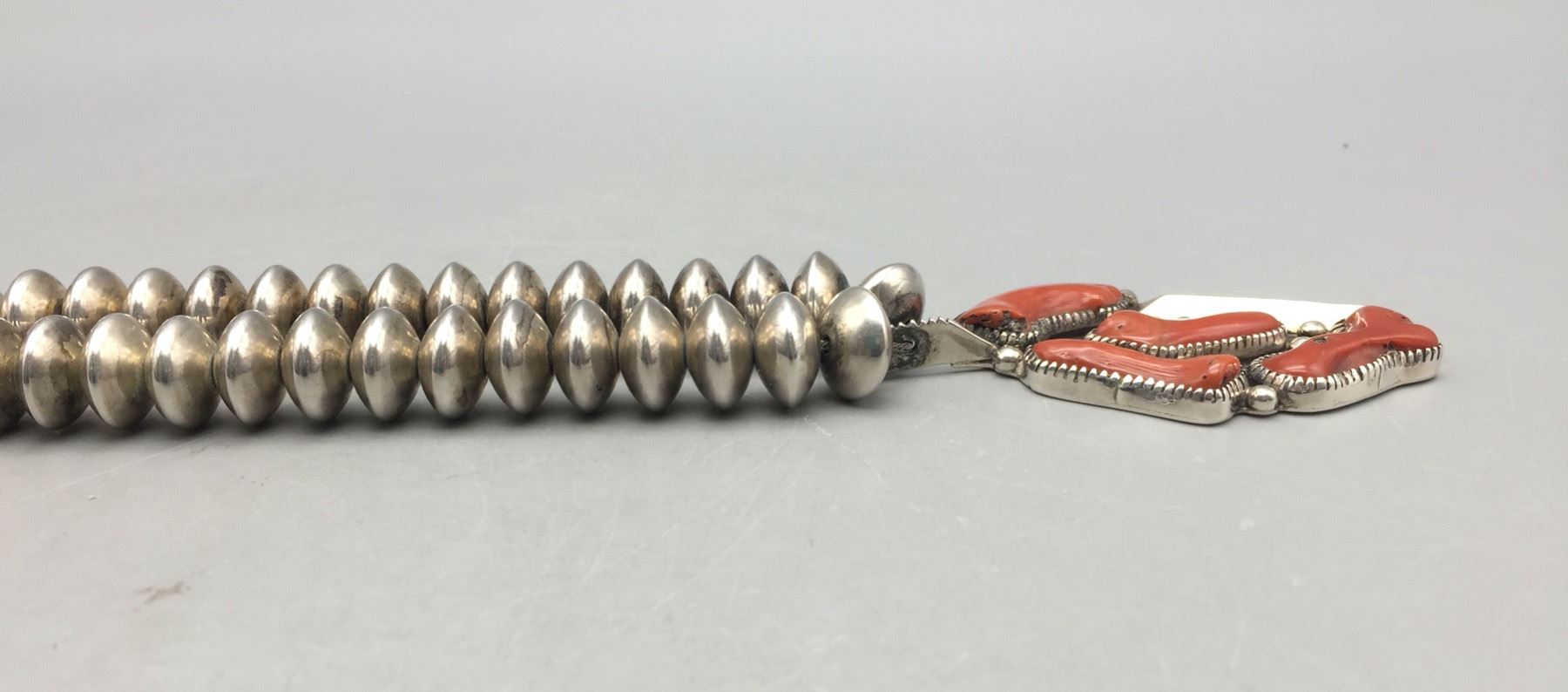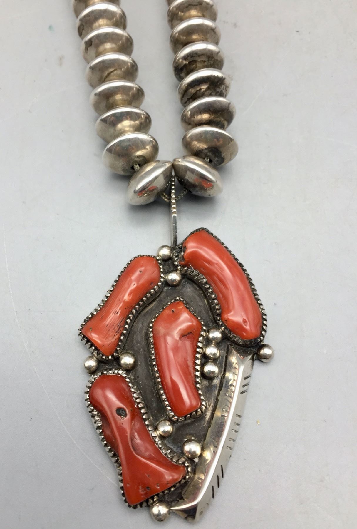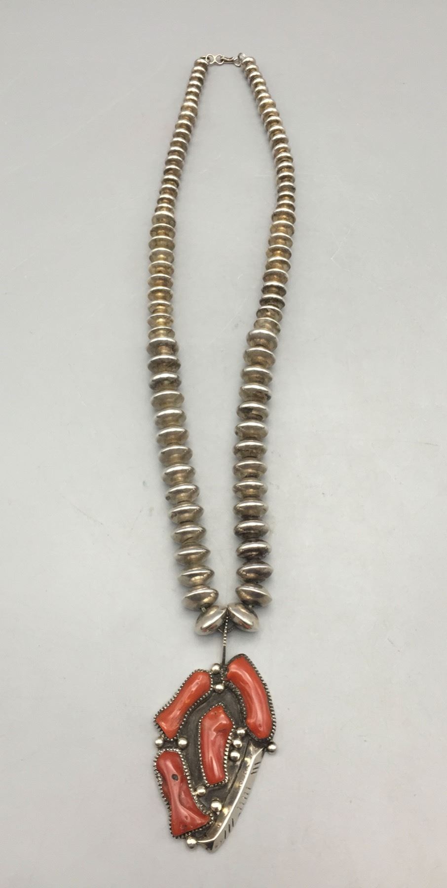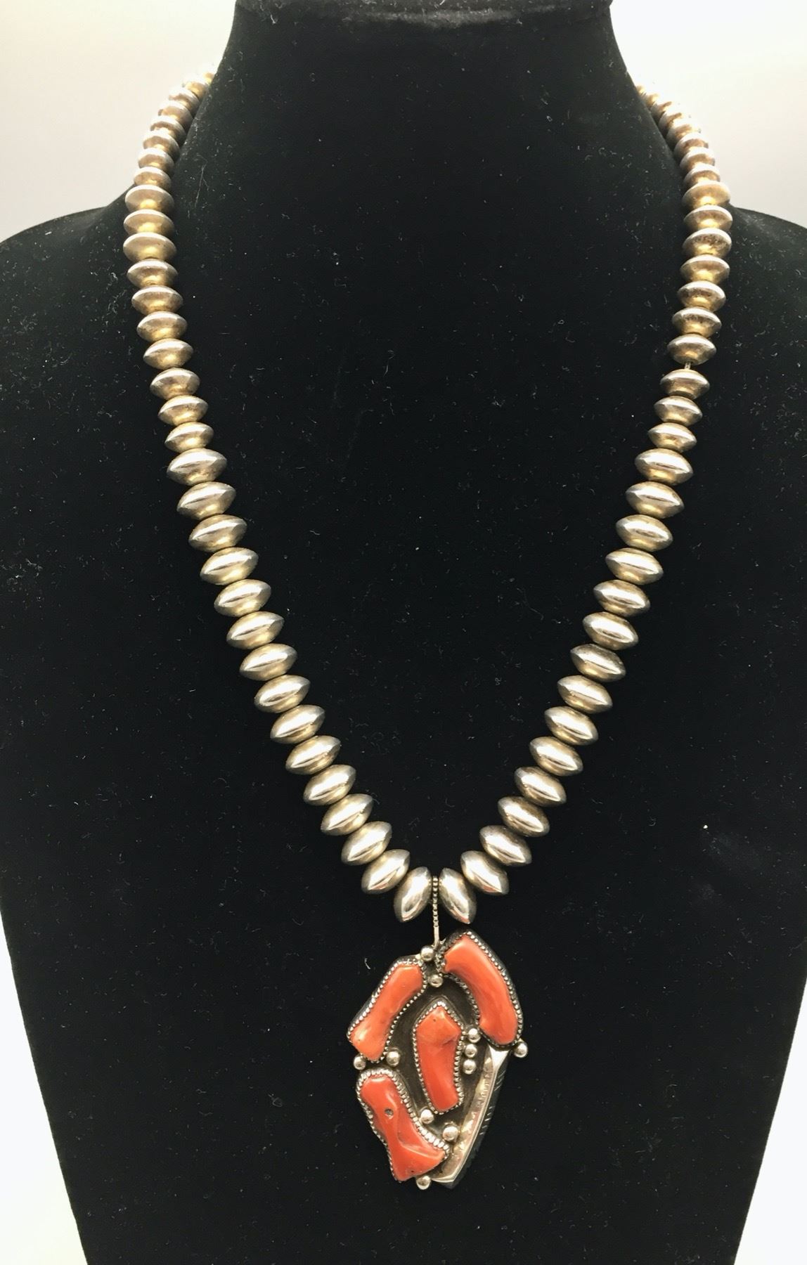 Description: Presented for sale in this lot we have a vintage “Navajo pearls” or silver beads necklace with a coral cluster pendant. This beautiful necklace has graduated sterling silver beads with a vibrant coral cluster pendant. Maker: The pendant is marked by Wilson Padilla, Navajo. Approx. Age: Vintage to modern. Size: Fits a 22 inch neck. Pendant is additional 3 inches long x 1-3/4 inches wide. Weighs 122.7 grams. Condition: Good for its age, normal wear expected. Please look closely at the pictures - they are an important part of our description. Shipping: There will be a $5 handling, packaging fee for shipping this lot. The actual cost of postage will be added on top of that.