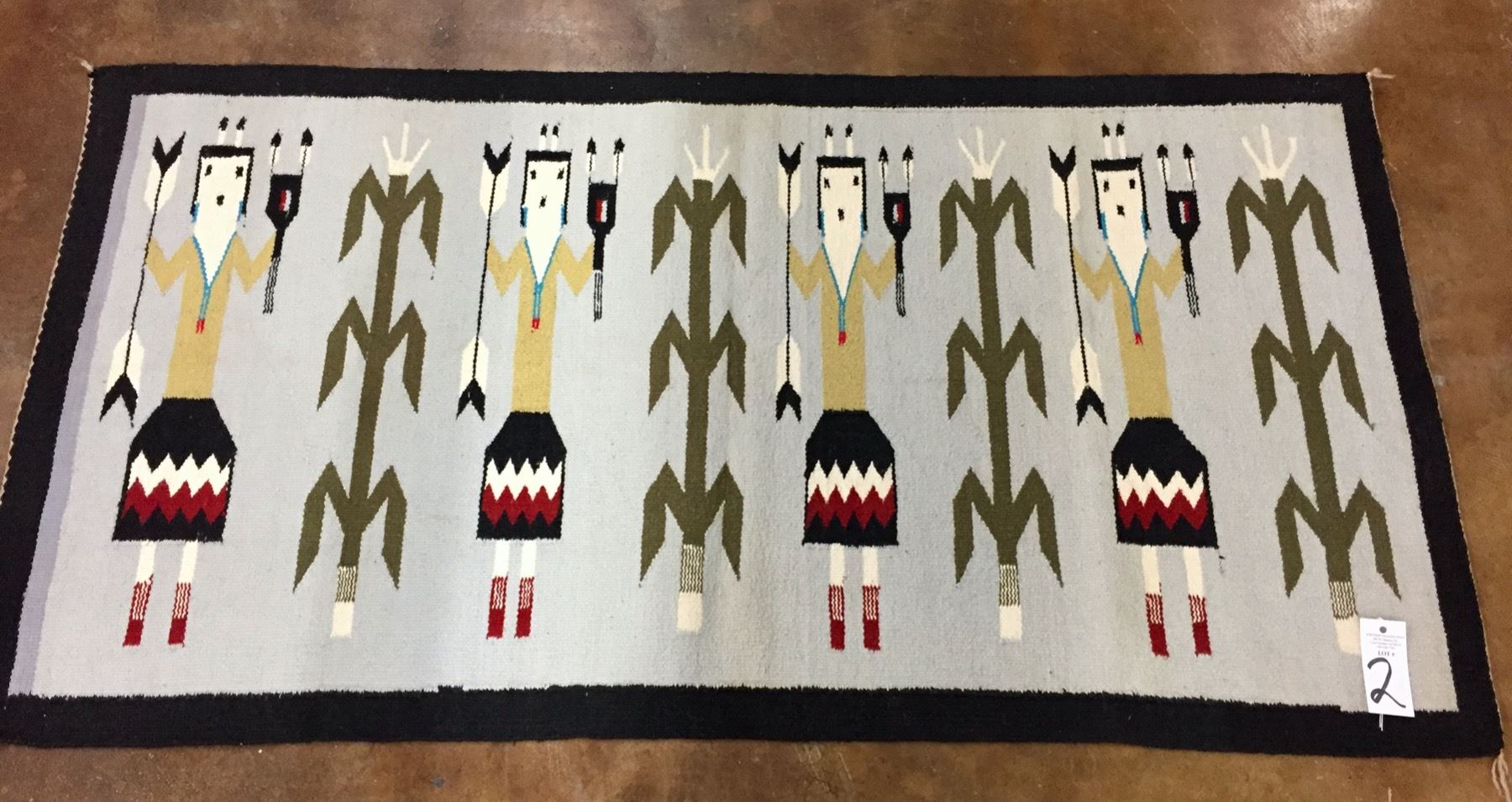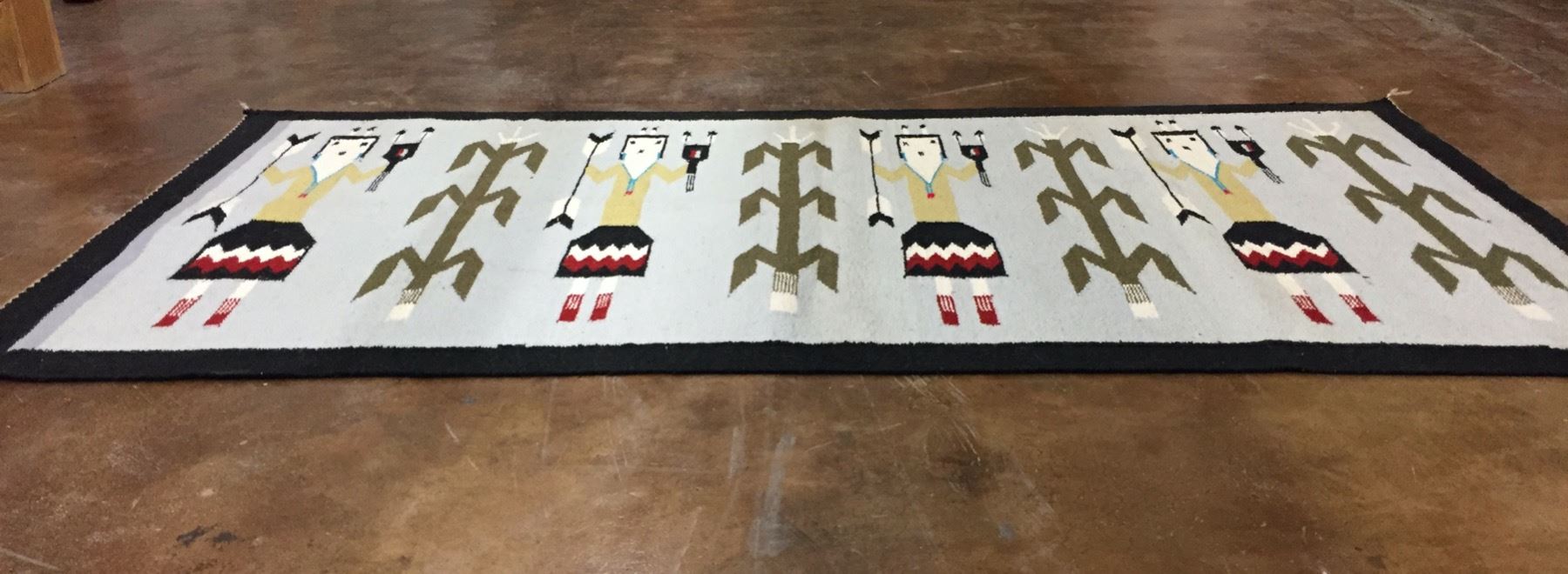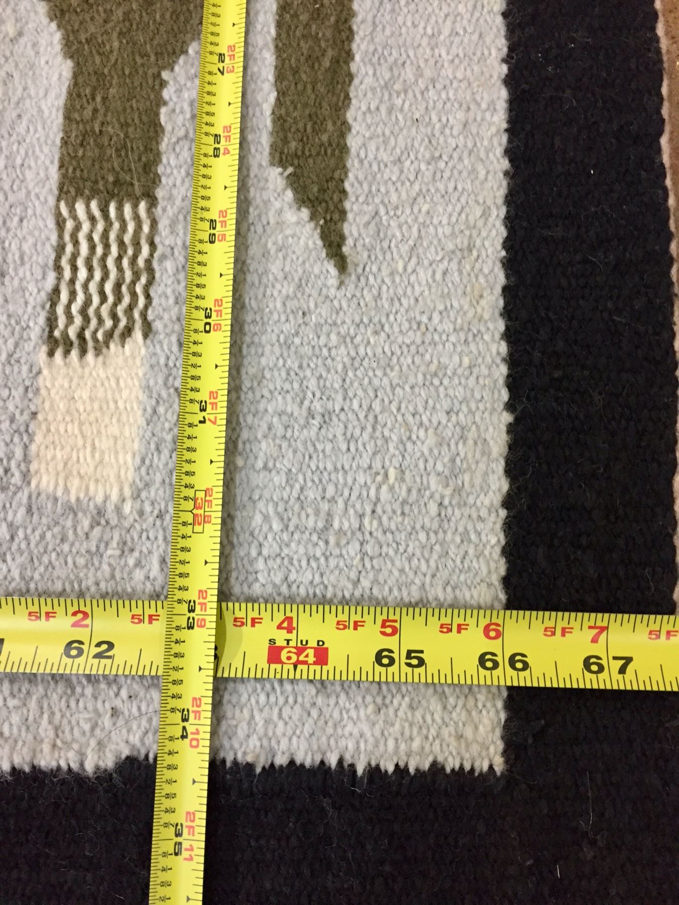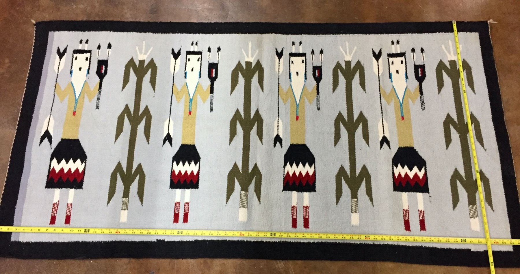 Description: Offered for sale in this lot is a gorgeous, vintage Navajo pictorial textile. This beautiful rug features Yei figures. It is woven with light blue, blue, red, black, white, and red, and has a nice tight weave. Maker: Unknown Navajo weaver. Approx. Age: Vintage, circa 1960s. Size: 68 inches wide x 37-1/2 inches long. Condition: Pretty good for its age, normal wear and minor imperfections expected. Please look closely at the pictures - they are an important part of our description. Shipping: There will be a $10 handling, packaging fee for shipping this lot. The actual cost of postage will be added on top of that.
