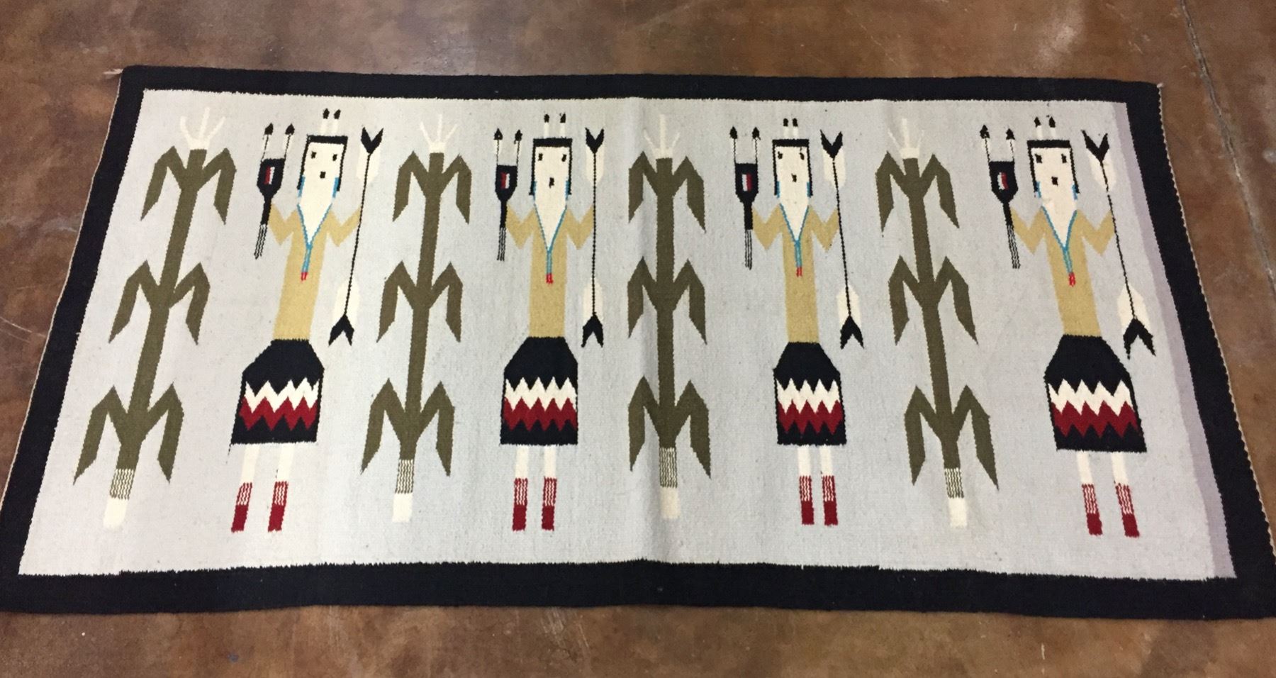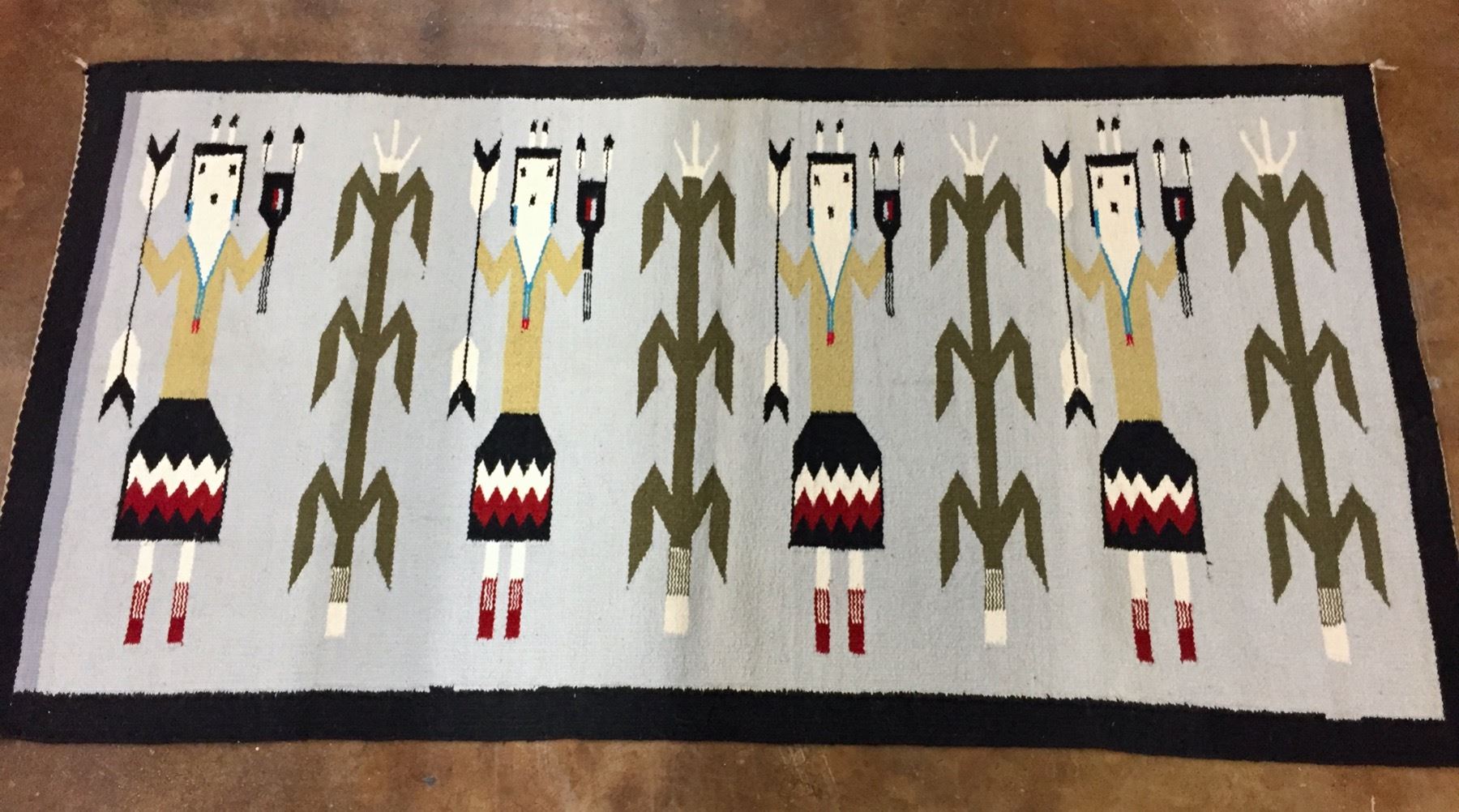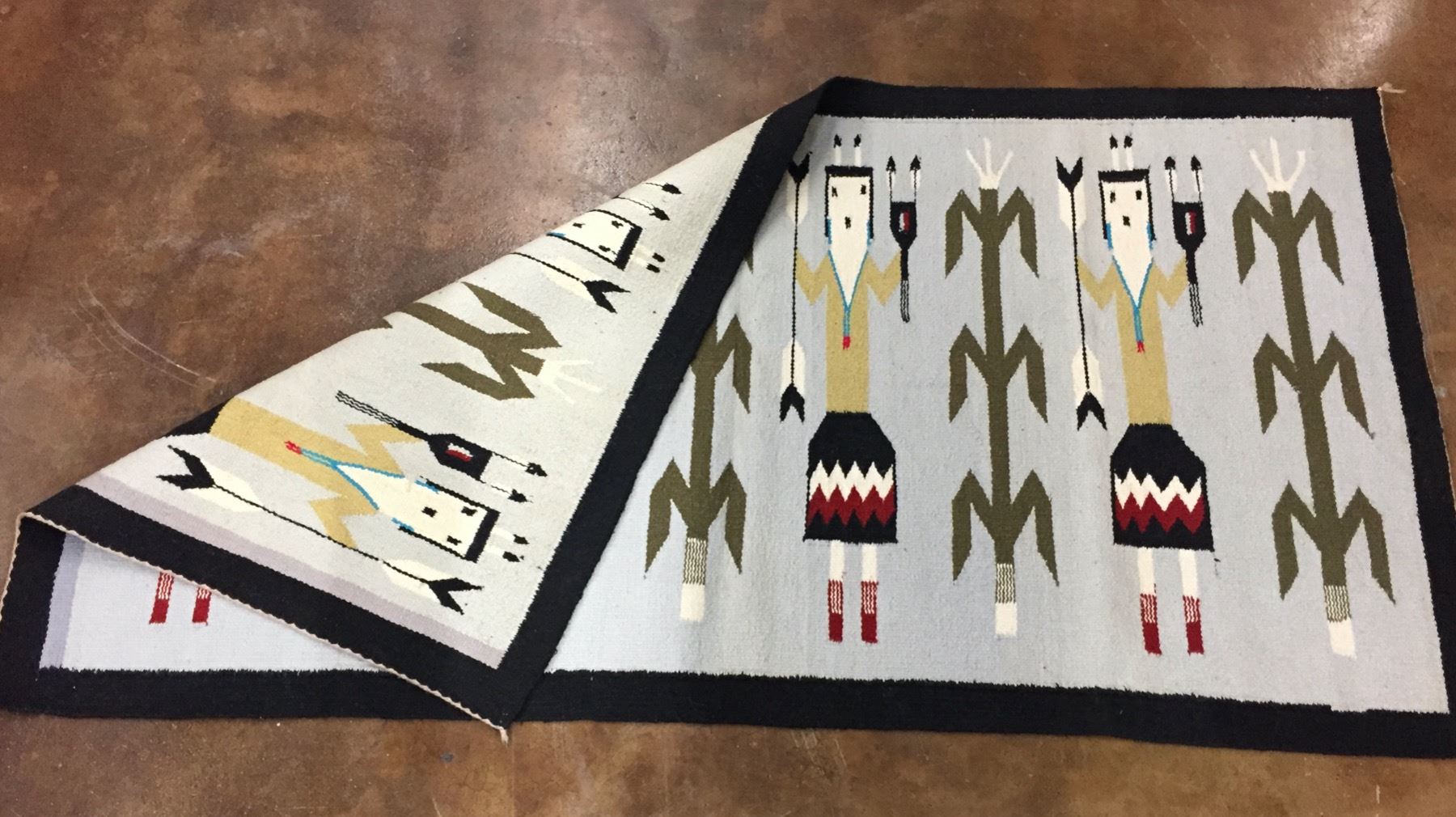 Description: Offered for sale in this lot is a gorgeous, vintage Navajo pictorial textile. This beautiful rug features Yei figures. It is woven with light blue, blue, red, black, white, and red, and has a nice tight weave. Maker: Unknown Navajo weaver. Approx. Age: Vintage, circa 1960s. Size: 68 inches wide x 37-1/2 inches long. Condition: Pretty good for its age, normal wear and minor imperfections expected. Please look closely at the pictures - they are an important part of our description. Shipping: There will be a $10 handling, packaging fee for shipping this lot. The actual cost of postage will be added on top of that.