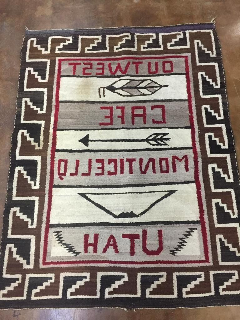 For your collection we offer a vintage Navajo pictorial textile featuring the words, Outwest Cafe Monticello Utah. The textile was woven in hand-dyed colors of browns, reds, backs, whites, and grays. Maker: Unknown Navajo weaver. Approx. Age: Circa 1950s. Size: 46 inches wide X 59 inches long. Condition: Pretty good for its age, some wear expected. Please look closely at the pictures - they are an important part of our description. Shipping: There will be a $10 handling / packaging fee for shipping this lot. The actual cost of postage will be added on top of that. BUY IT NOW: If you would like to buy this item now without waiting for the auction to end (this option is only available up to 48 hours before the auction starts to close), the “Buy it Now” price is the high estimate of this lot. If you would like to end the auction early and pay the high estimate (plus applicable fees), please contact us by phone or email and reference this lot number.