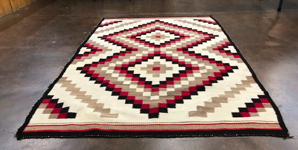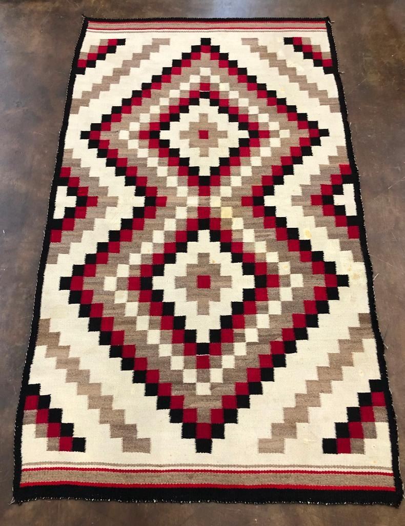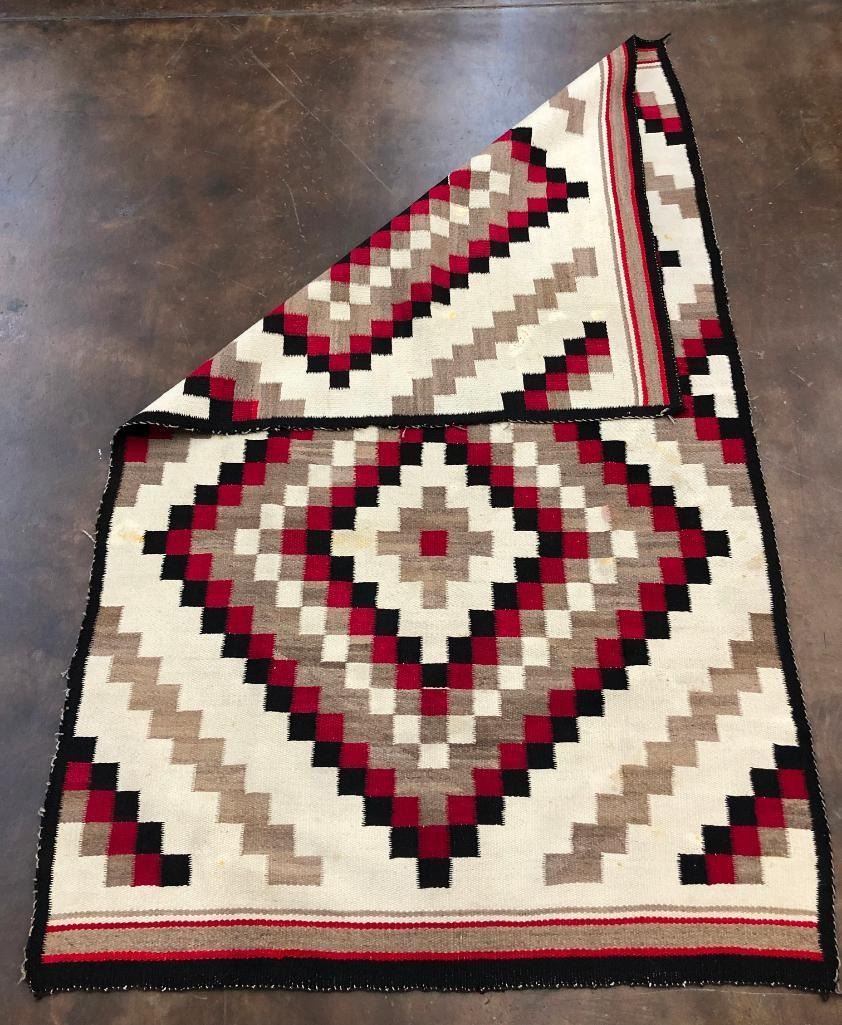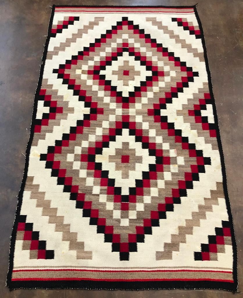 Offered for sale in this lot is a vintage Navajo rug featuring an eye dazzling design in reds, whites, browns, and blacks. Maker: Unknown Navajo Weaver. Approx. Age: Vintage. Size: 44-1/2 inches wide X 73-1/2 inches long. Condition: Good for its age, normal wear expected. Please look closely at the pictures - they are an important part of our description. Shipping: There will be a $8 handling / packaging fee for shipping this lot. The actual cost of postage will be added on top of that. BUY IT NOW: If you would like to buy this item now without waiting for the auction to end (this option is only available up to 48 hours before the auction starts to close), the “Buy it Now” price is the high estimate of this lot. If you would like to end the auction early and pay the high estimate (plus applicable fees), please contact us by phone or email and reference this lot number.