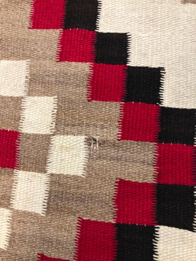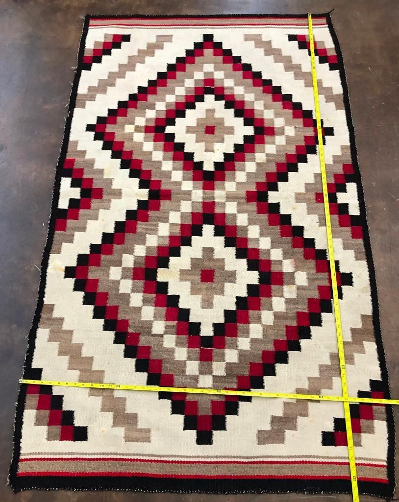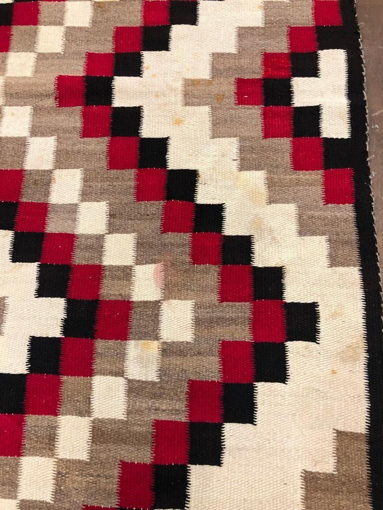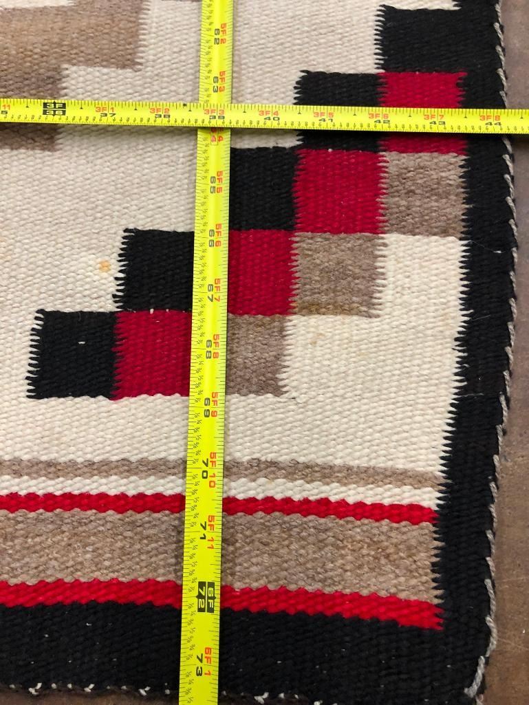 Offered for sale in this lot is a vintage Navajo rug featuring an eye dazzling design in reds, whites, browns, and blacks. Maker: Unknown Navajo Weaver. Approx. Age: Vintage. Size: 44-1/2 inches wide X 73-1/2 inches long. Condition: Good for its age, normal wear expected. Please look closely at the pictures - they are an important part of our description. Shipping: There will be a $8 handling / packaging fee for shipping this lot. The actual cost of postage will be added on top of that. BUY IT NOW: If you would like to buy this item now without waiting for the auction to end (this option is only available up to 48 hours before the auction starts to close), the “Buy it Now” price is the high estimate of this lot. If you would like to end the auction early and pay the high estimate (plus applicable fees), please contact us by phone or email and reference this lot number.