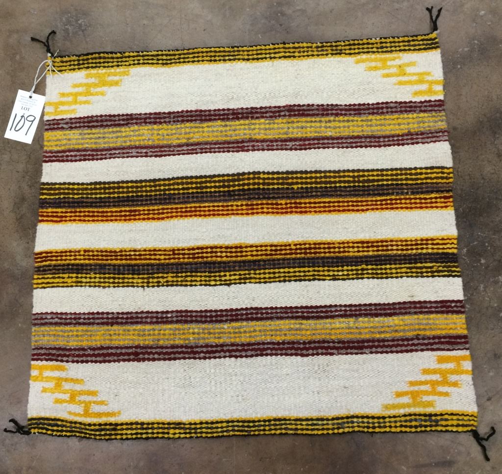 This handmade Navajo Textile measures 31” X 29.5” and is in good condition. Very colorful!