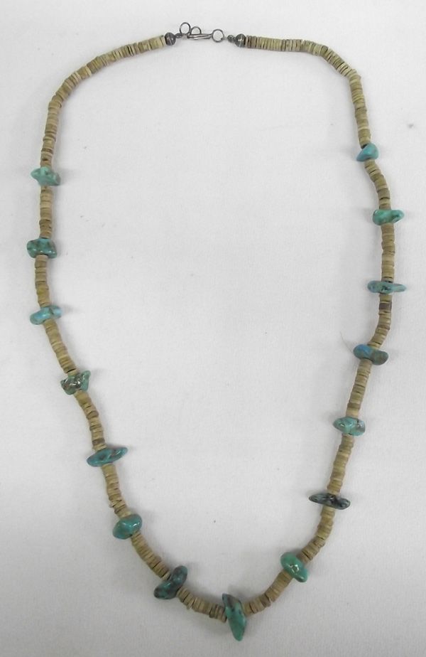 Vintage Navajo Puka Shell Heishi Turquoise Necklace, features 15 natural turquoise nuggets, two silver bead accents and silver clasp, measures 24'' end to end