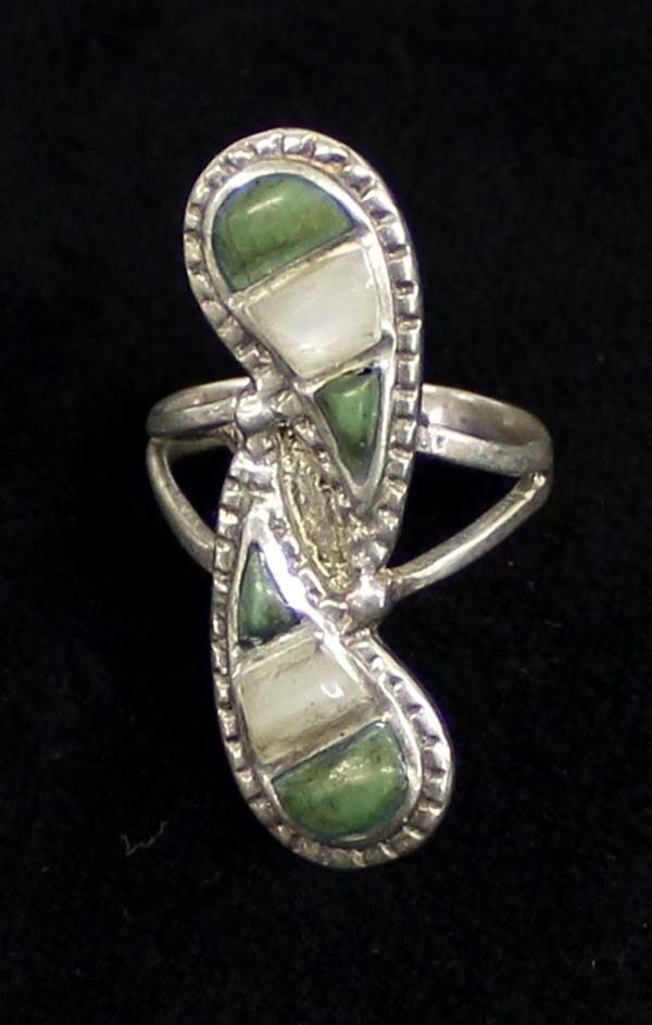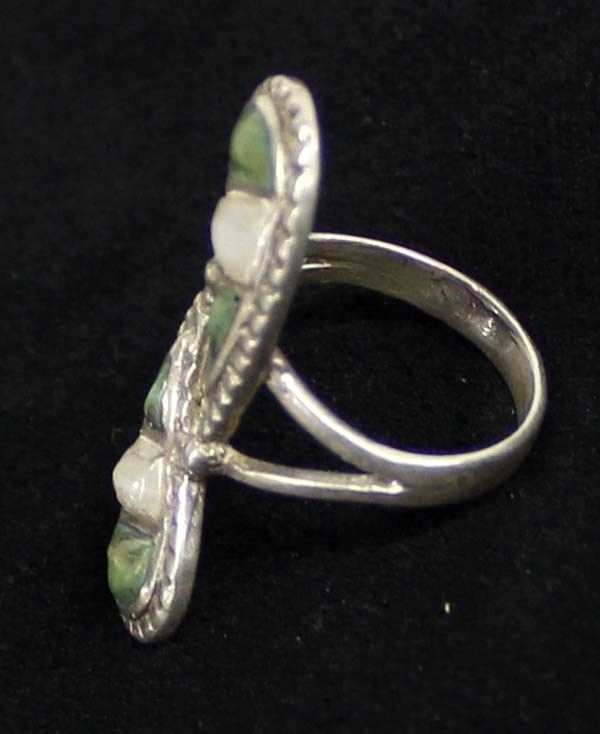 Vintage Native American Navajo Silver, Nevada Green Turquoise, and Mother of Pearl Inlay Ring, Size 7, measures 1''L, ca. 1960s Little White Dove Trading