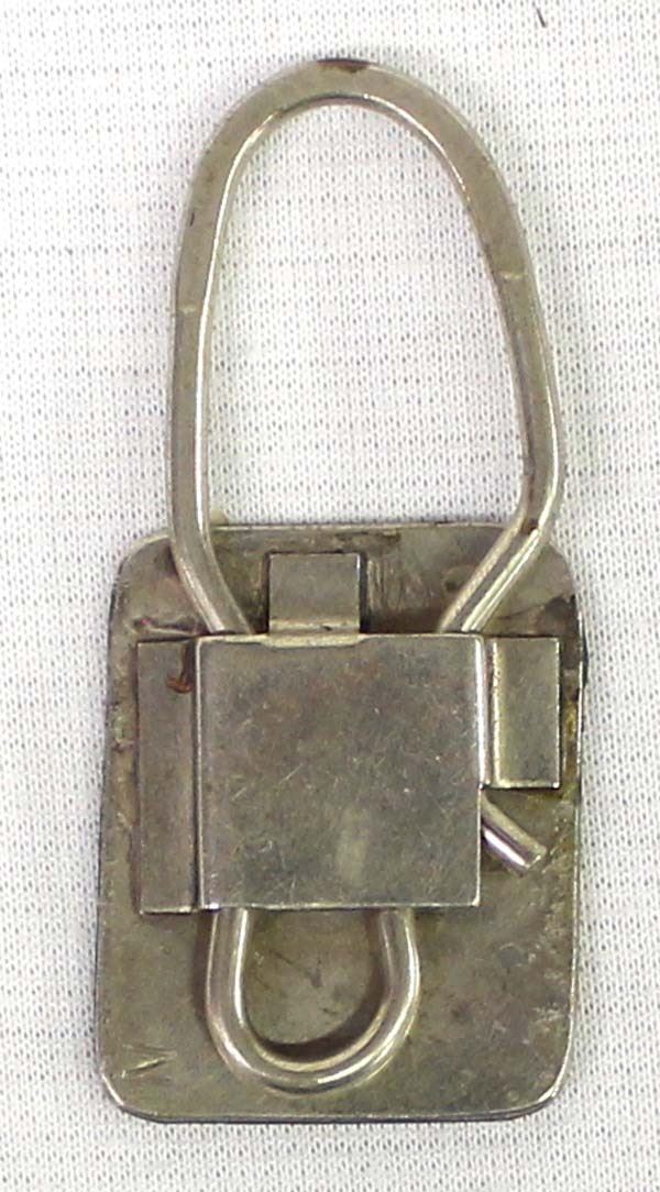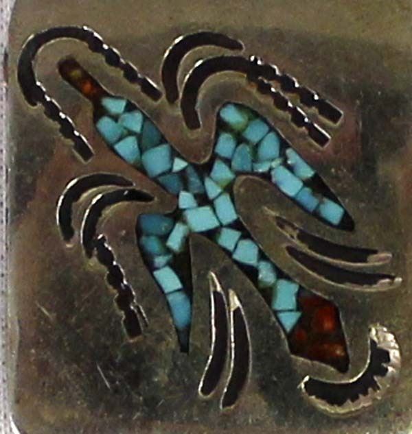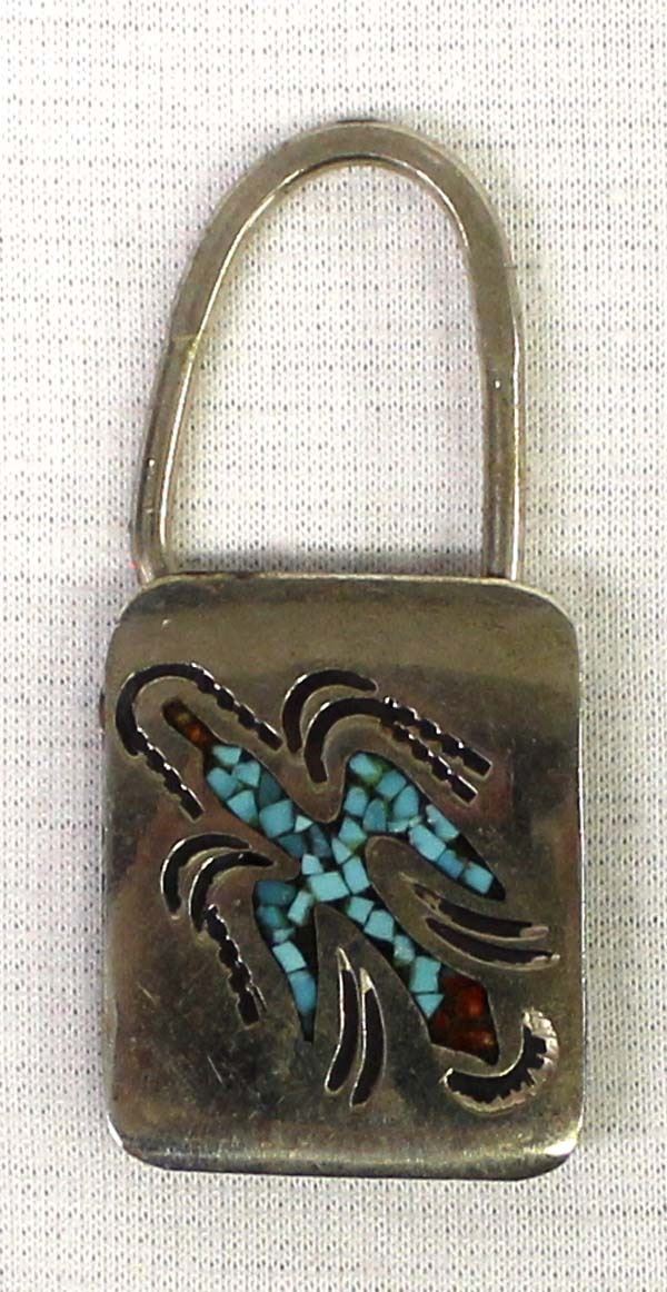 Vintage Native American Navajo Sterling Chip Inlay Turquoise and Coral Rain Bird Keyring, hallmarked N, measures 1'' x 2''