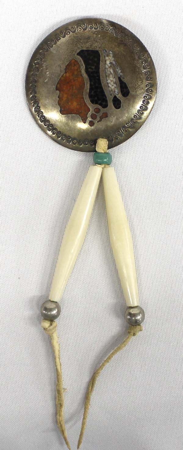 Antique/Vintage Native American Navajo Sterling Turquoise, Coral, and Onyx Chip Inlay Concho Pendant by Corbet Joe, hand stamped details, the drop includes two 2.5'' hair pipe bone beads strung on leather embellished with 2 sterling and 1 turquoise bead, hallmarked with a misaligned CJ, concho measures 3''D and the drop measures 5''