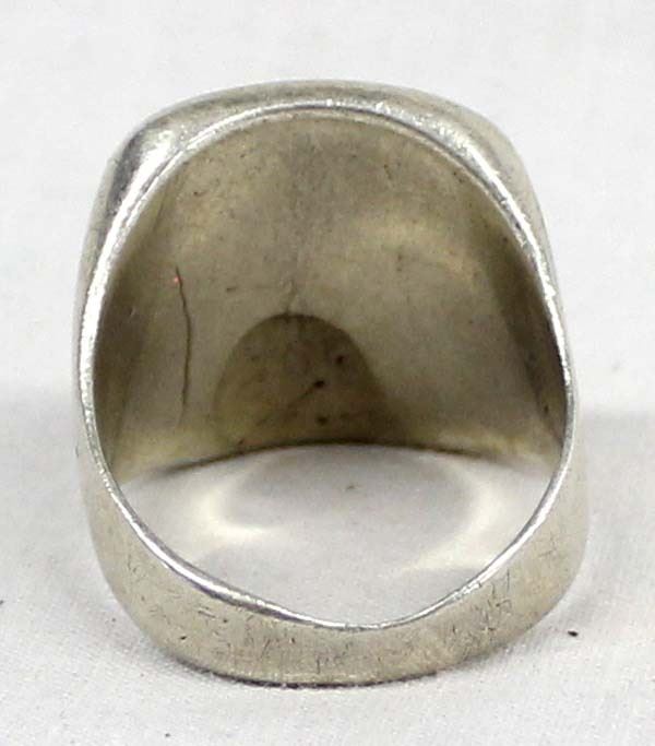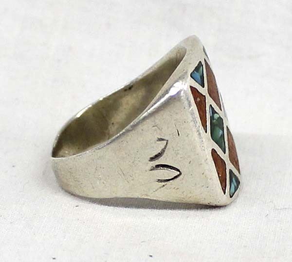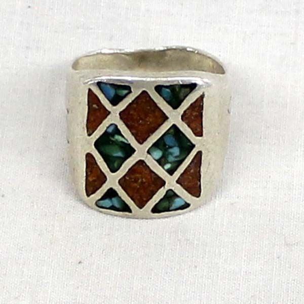 Vintage Native American Navajo Sterling & Chip Inlay Turquoise and Coral Ring, Size 9, measures 7/8'' x .75''