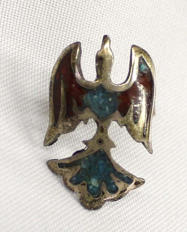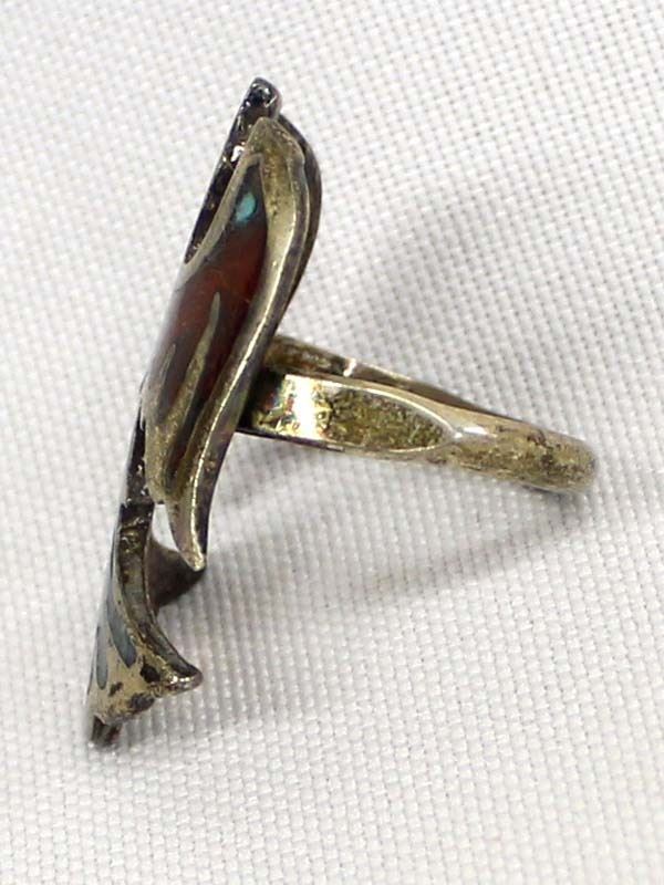 Vintage Native American Navajo Sterling & Chip Inlay Peyote Bird Ring, size 7.5 and measures 1 3/8''L, inlay of coral and turquoise