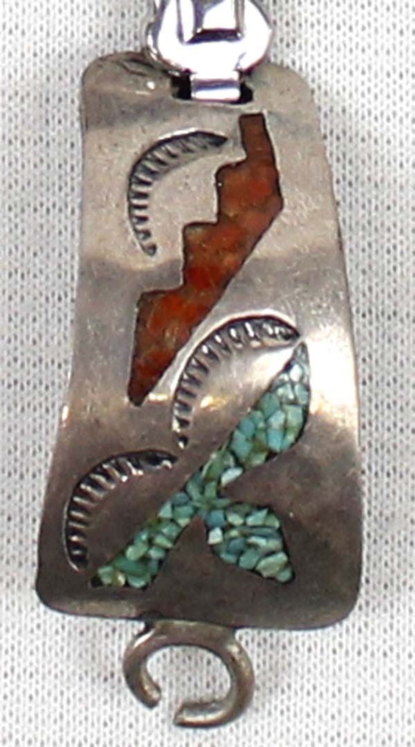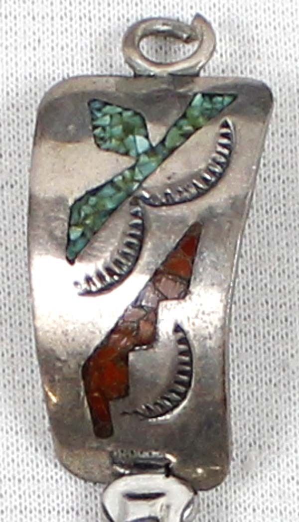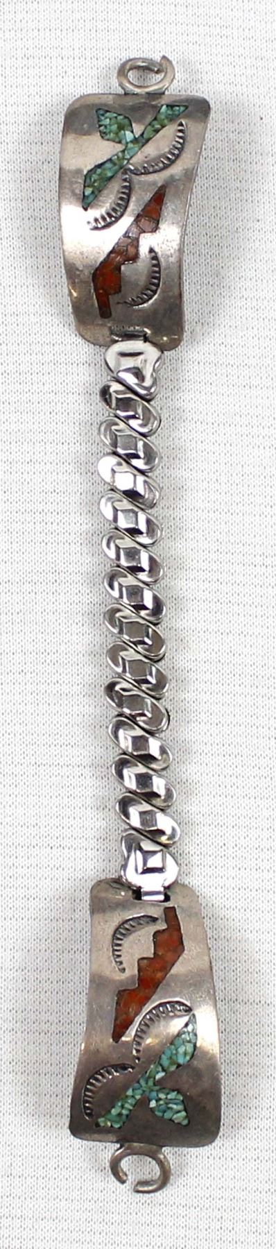 Vintage Native American Navajo Sterling Chip Inlay Watch Band, Turquoise & Coral, hallmarked, tips measure 1.5''L