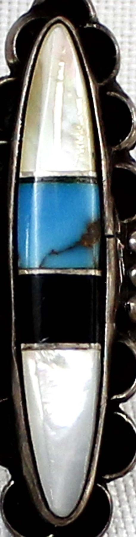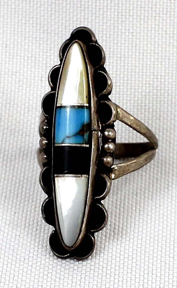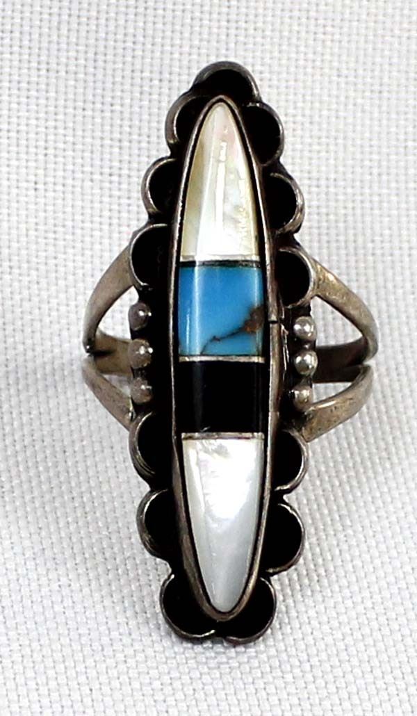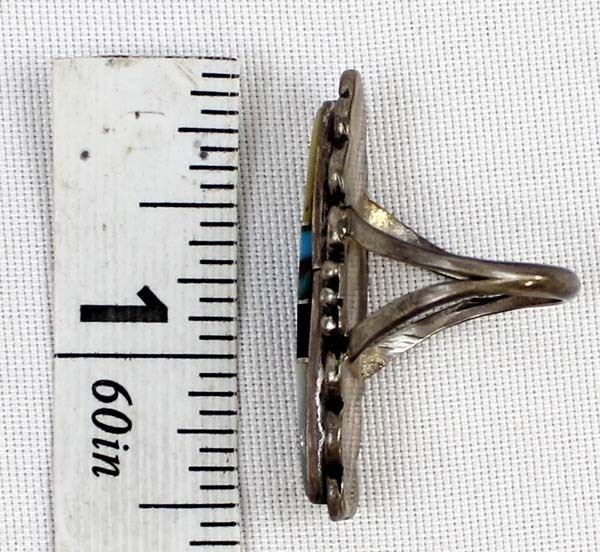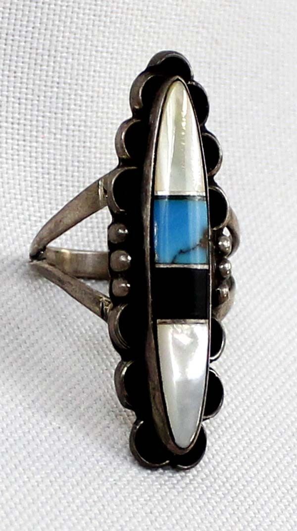 Vintage Native American Navajo Sterling Inlay Ring, Size 7.5, measures 1.5''L, inlay includes turquoise, mother of pearl, and jet