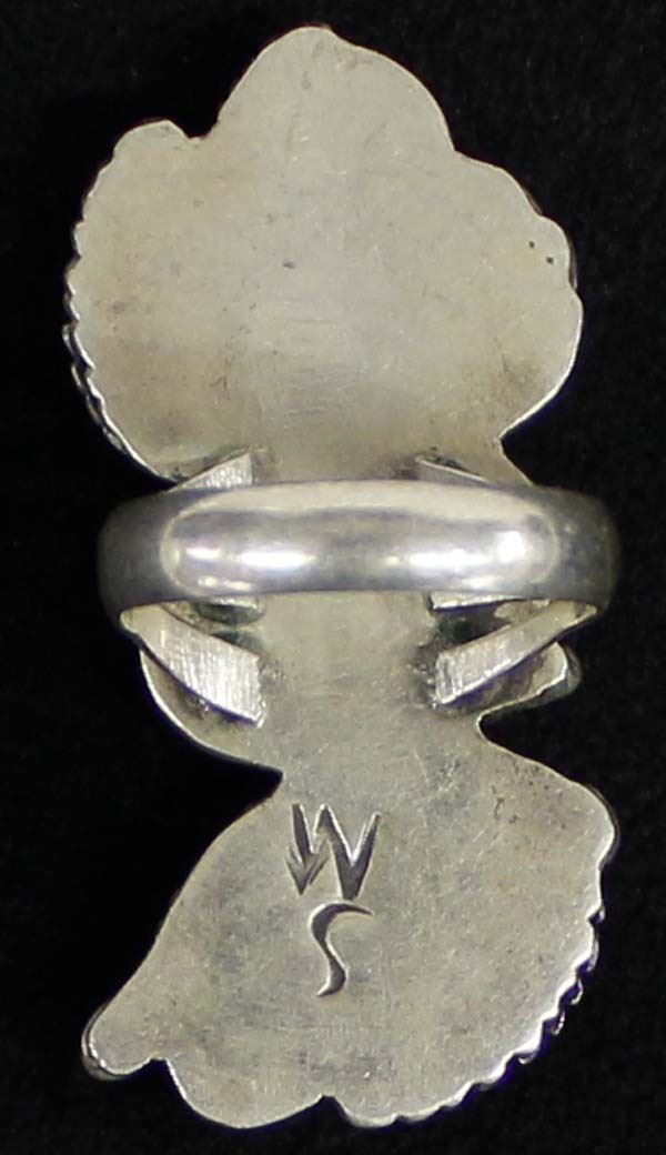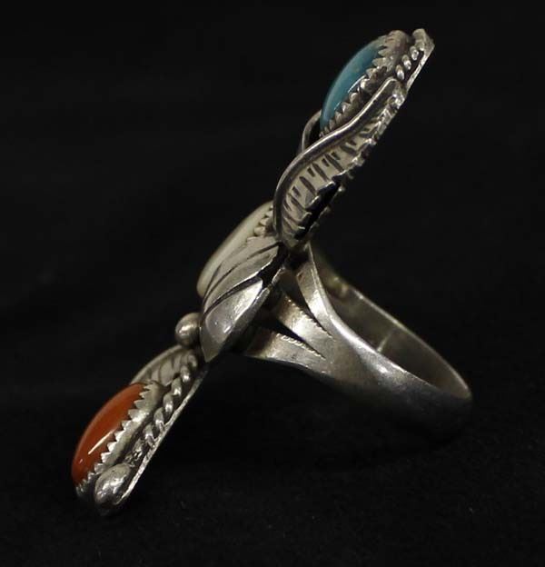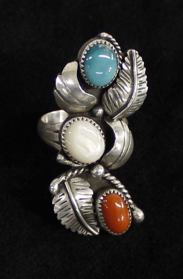 Vintage Navajo Sterling Turquoise, Coral, and Mother of Pearl Ring, Size 8, measures 2.5''L, hallmarked WS, ca. 1960s Little White Dove Trading, beautiful piece of jewelry