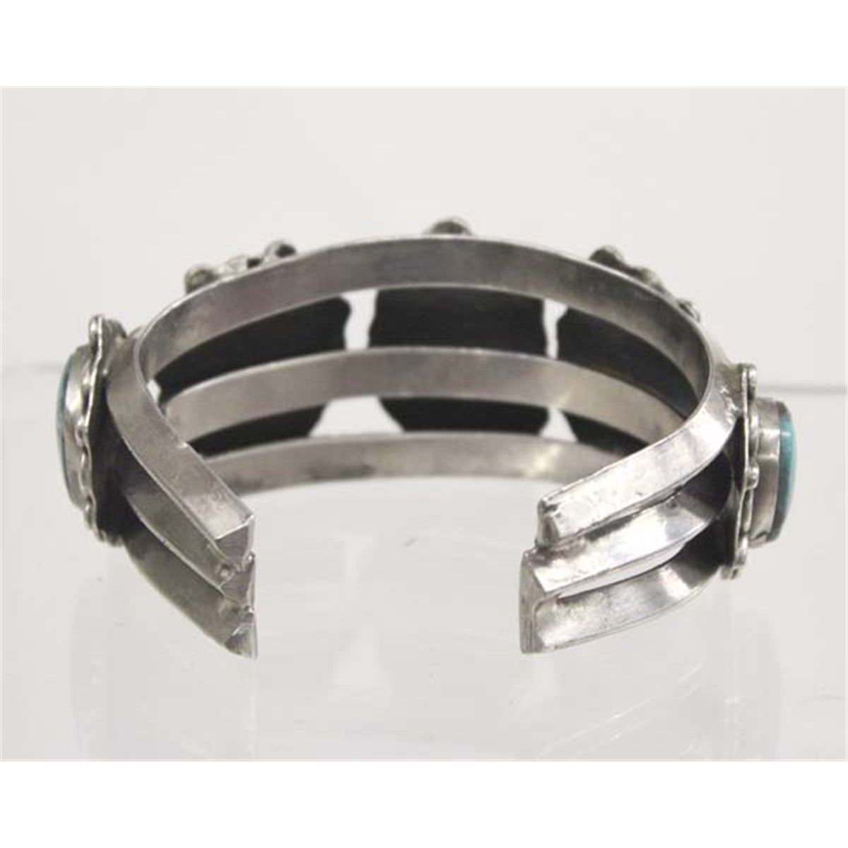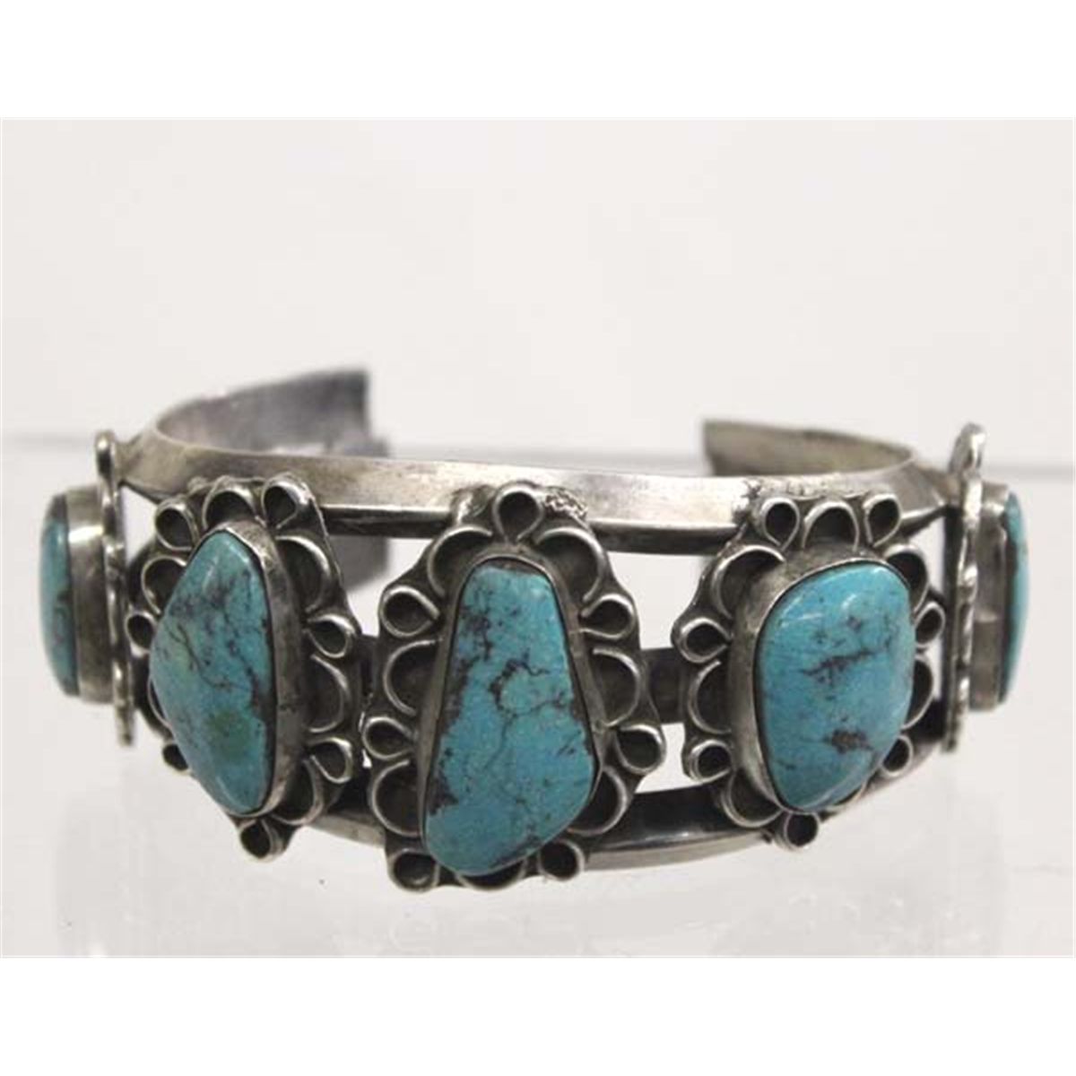 Vintage Navajo Sterling Turquoise Bracelet, measures approx. 6.75" inside measurement with a width of 1 5/8". Bracelet is heavy with five large cabochons that measure approx. 1x.5". Buyers Pay Actual Shipping and Handling Charges(see terms and conditions for more information)
