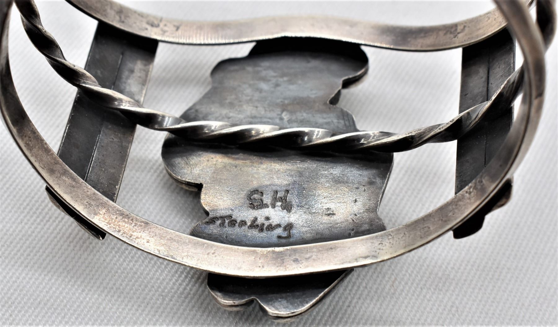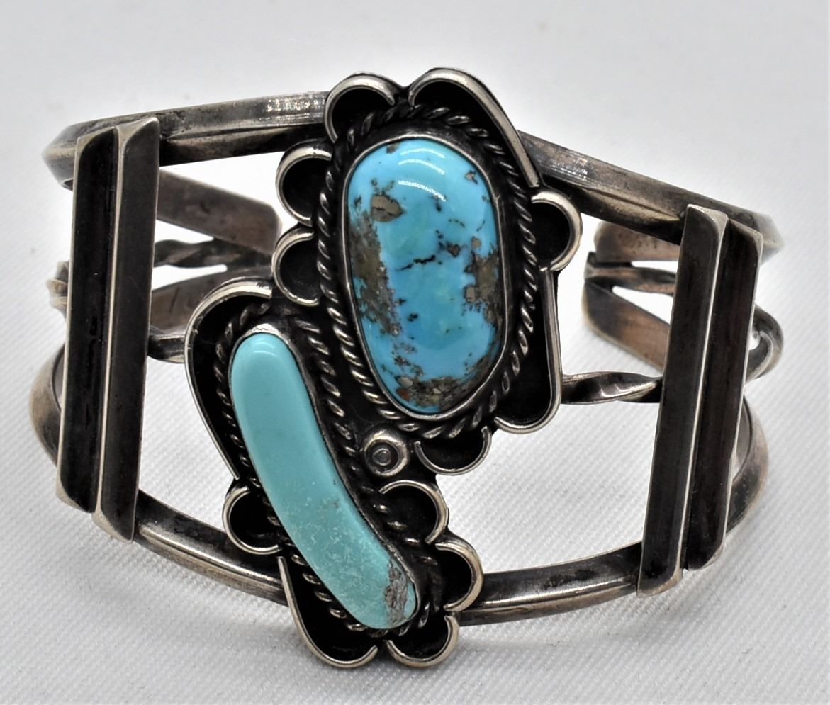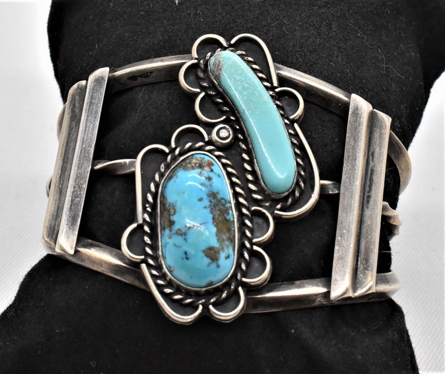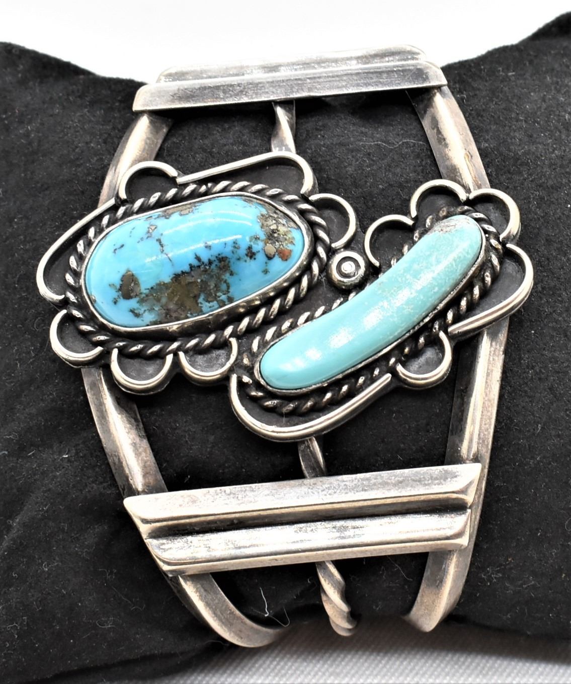 Vintage Native American Navajo Sterling Turquoise Cuff Bracelet by Shirley Henry, inside measures 6.5'' which includes the gap x 2''W, engraved initials S. H. and sterling inside, total gram wt. of 46.12